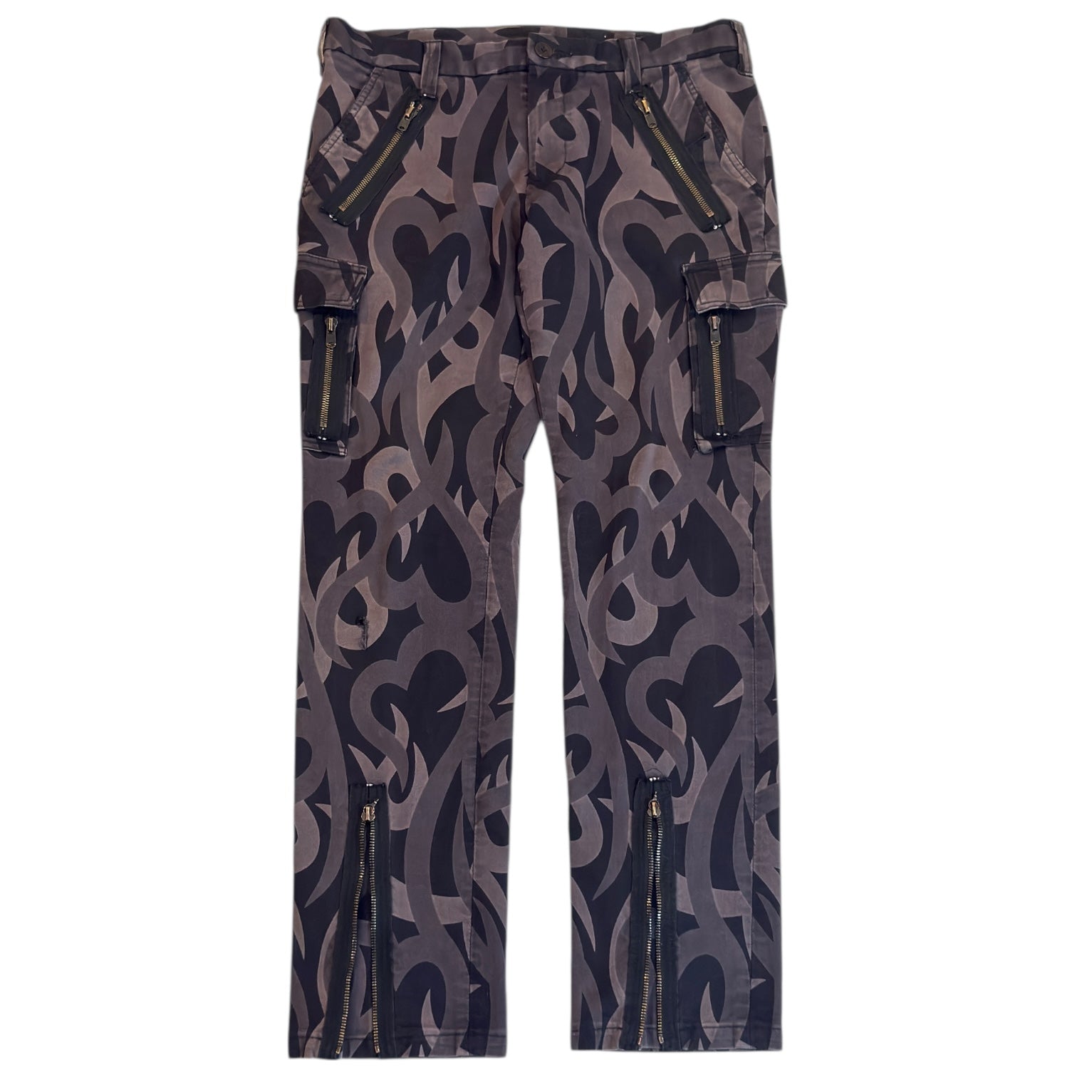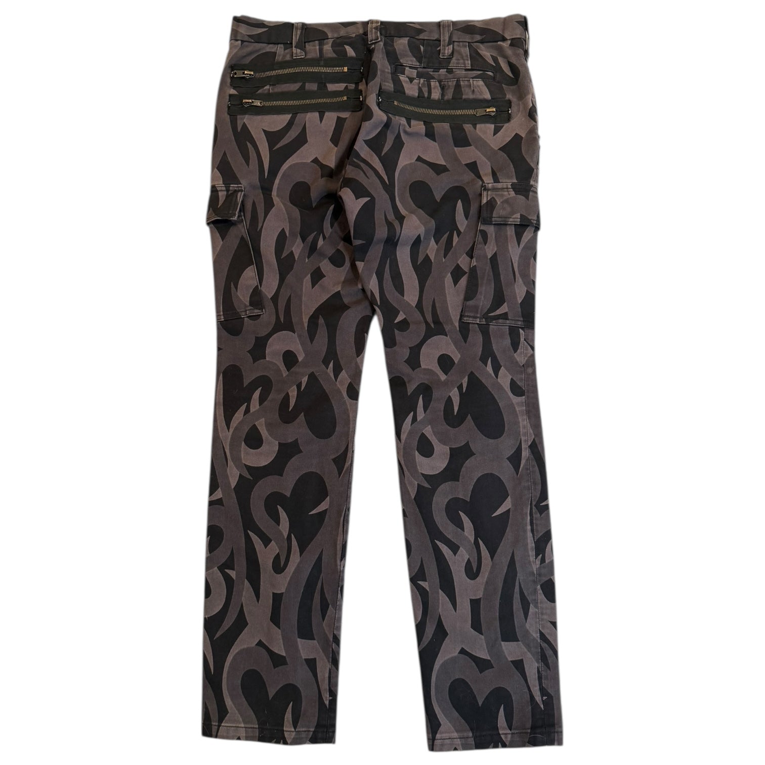 Number (N)ine Autumn 2004 ‘Give Peace A Chance’ Heart Camo Cargo Pants, tag size 4 measures 32.5 waist 10 rise 12.5 back rise 29.25 inseam 7 leg opening. In good used condition for age, one small damage near left leg zipper, invisible in photos and when worn.
