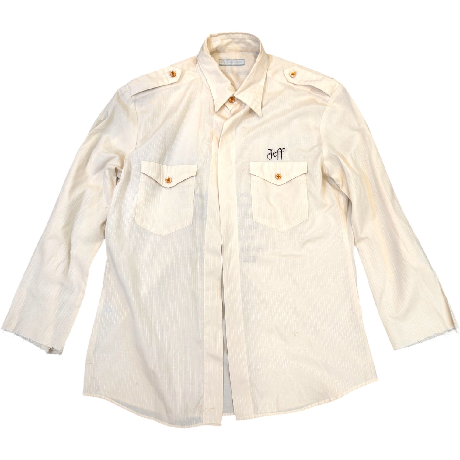 Number (N)ine Spring 2001 ‘Time Migration’ Runway Mystery White Boy Pinstriped 3/4 sleeve Shirt tagged size 4 measures 18 pit to pit 20.75 pit to pit 26 length 20 sleeves. An homage to the American musician Jeff Buckley, this garment features an embroidered quote of his on the back and his name on the front, with the name’Mystery White Boy’ centered on the back. In great used condition for age