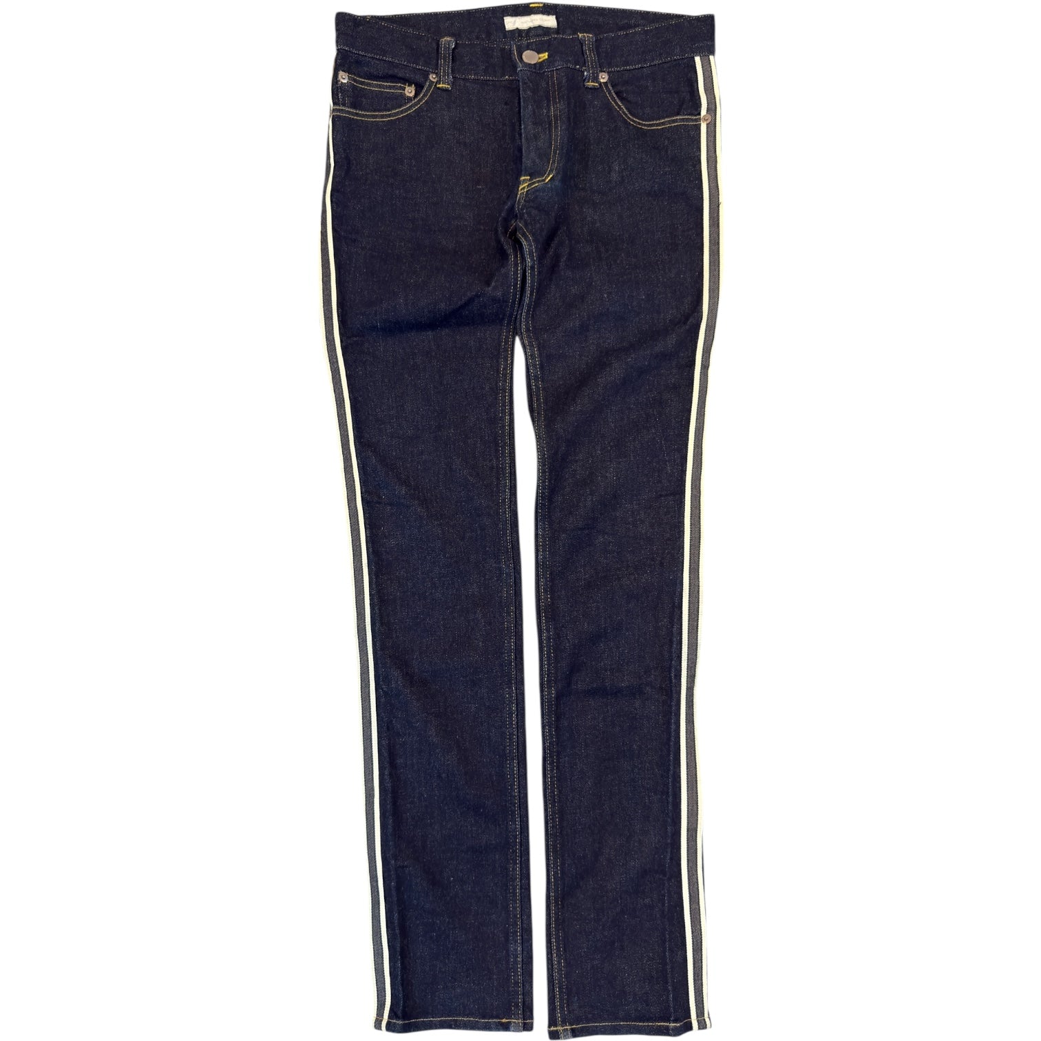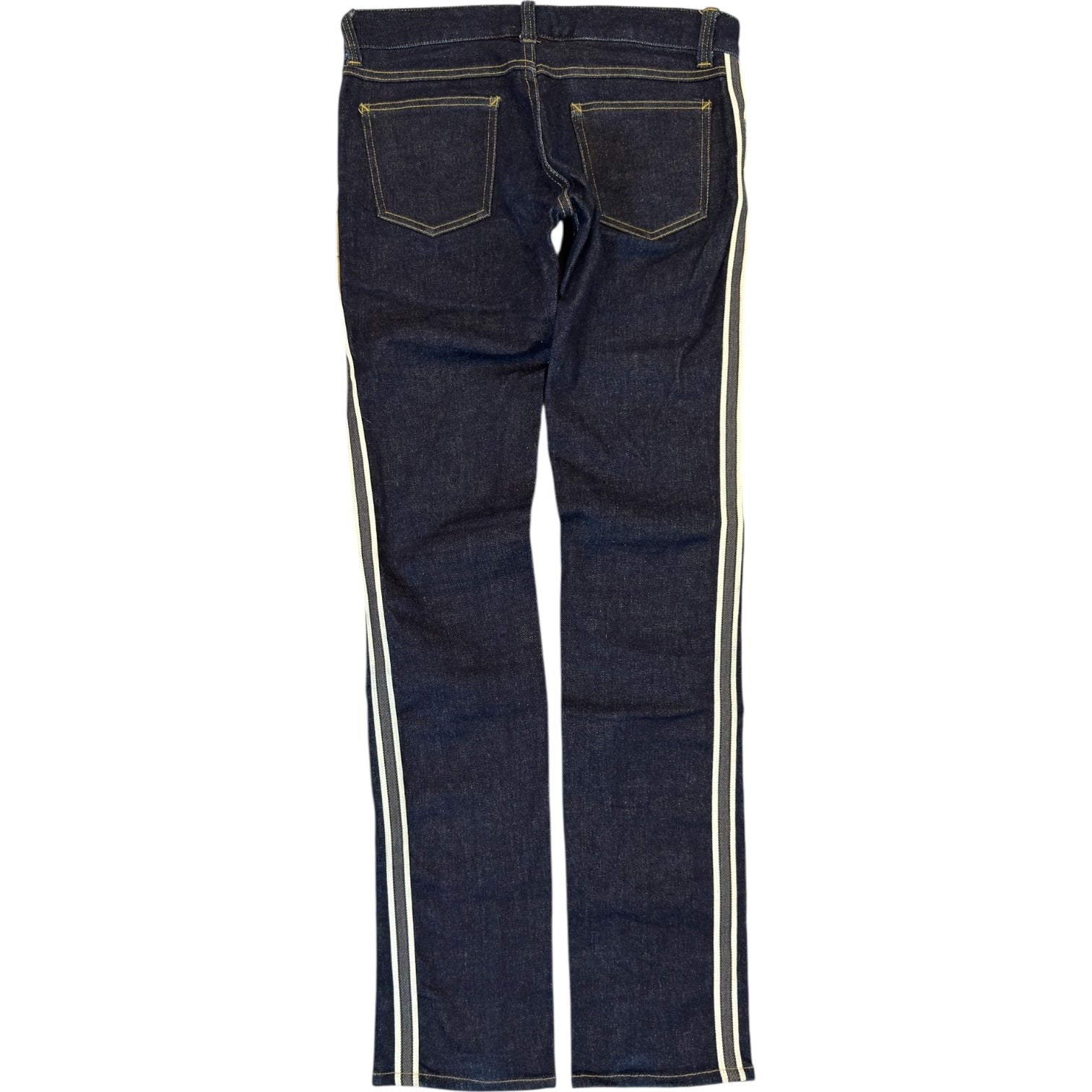 Number (N)ine x Bape Spring 2002 Sideline Stretch Denim tagged 2 measures 30 waist 9 rise 12 back rise 32 inseam 7 leg opening. Flawless