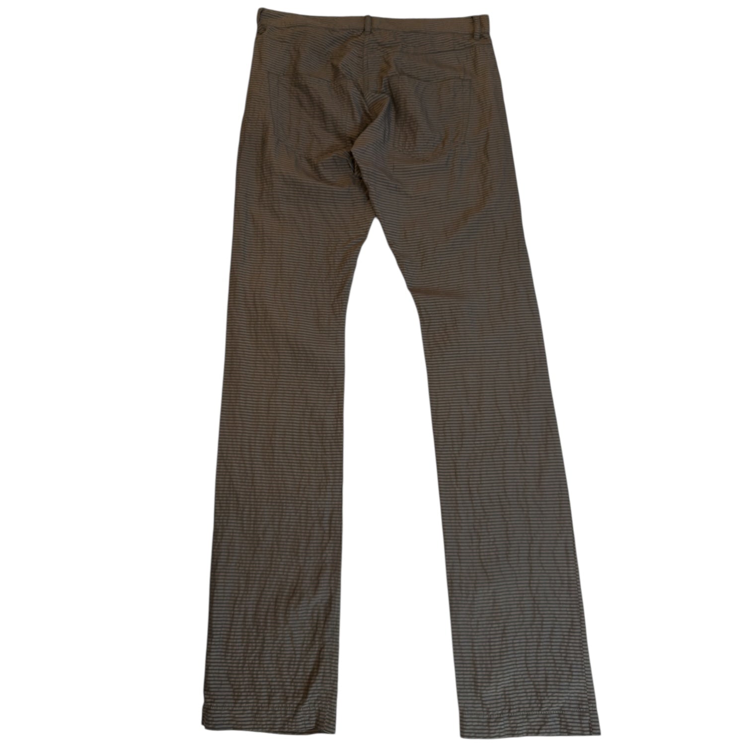 Rick Owens Spring 2012 ‘Naska’ Silk Jacquard Detroit in Dark Dust, a lightweight, slightly textured 68% silk 32% cotton blend in a horizontal-striped dark green with carved Corozo buttons. Tagged size 48, unhemmed, measures 33 waist 9.5 rise 13.4 back rise 35.75 inseam 7.5 leg opening. In flawless condition