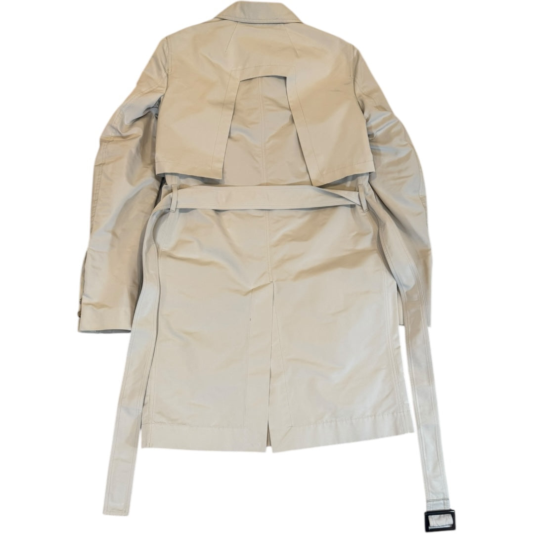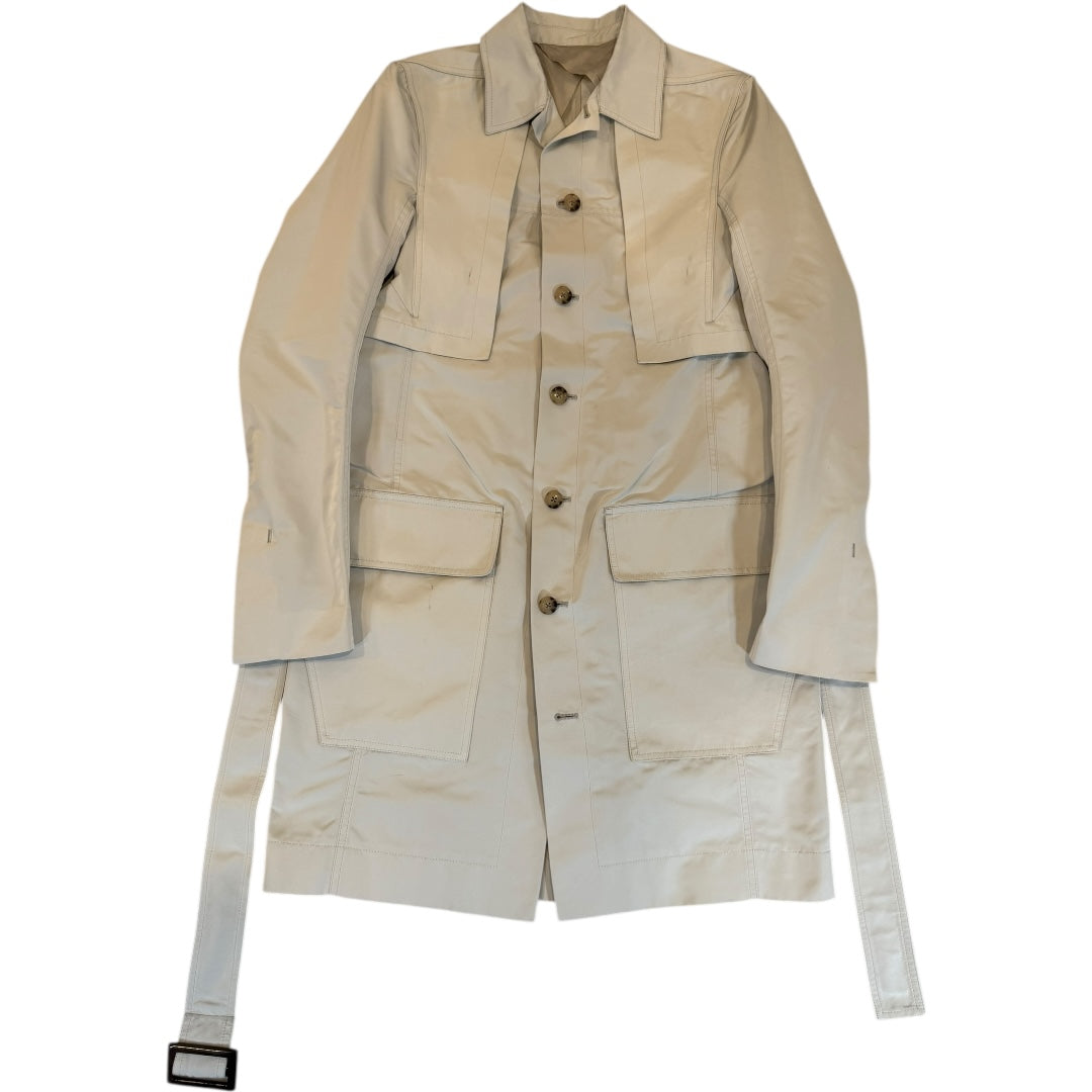 Rick Owens SS2019 ‘Babel’ Runway Narrow Trench Cape size 48, Oyster in material TF - 100% Econyl recycled polyamide made entirely from waste material. This incredible runway trench coat from the summer 2019 ‘Babel’ Runway features an overlay at the shoulders, reminiscent of vintage hunting jackets, updated with signature Rick Owens geometry. Using corozo buttons and buckles made from trees grown on Owens’ own Concordia, Italy property and a full cupro lining this garment fully embraces the label’s ecological values without sacrificing the incredible attention to detail expected from a Rick Owens runway. Two small marks at chest, may be removed with cleaning. Fully tagged. Size 48 fits men’s M women’s XL measures 19 pit to pit 17.25 shoulders 28 sleeves 38 length.