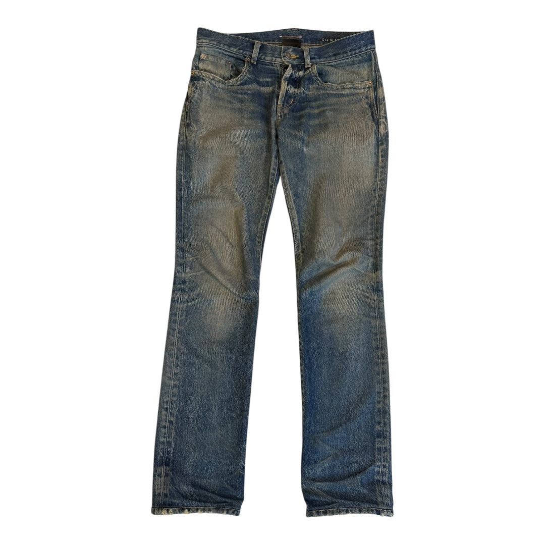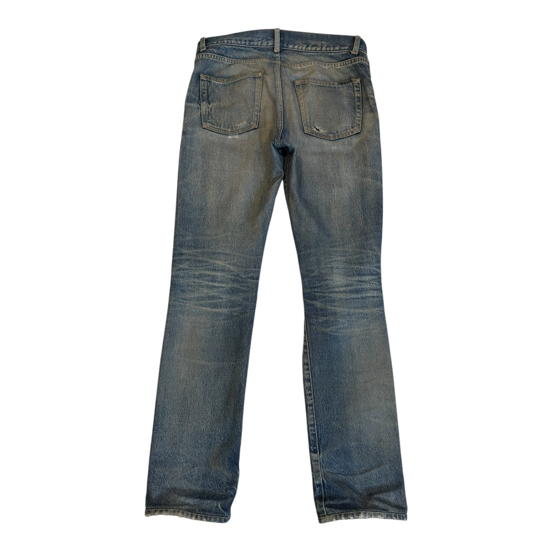 Saint Laurent 2023 Made in Japan D18 tagged size 28 measures 32 waist 9.75 rise 13.5 back rise 31.75 inseam 7 leg opening. Rip along top of front left pocket, signs of wear on back pockets and seat, reflected in price.