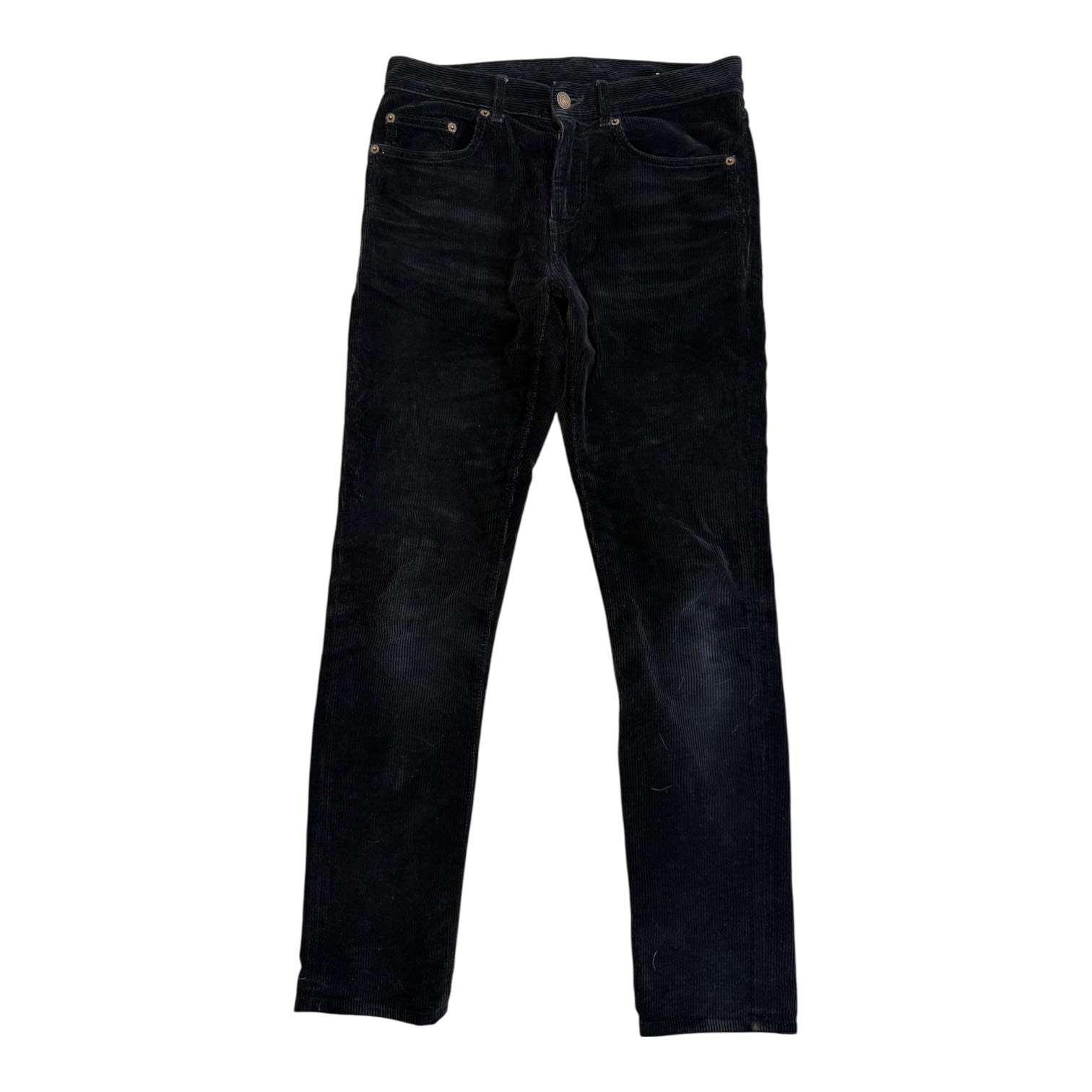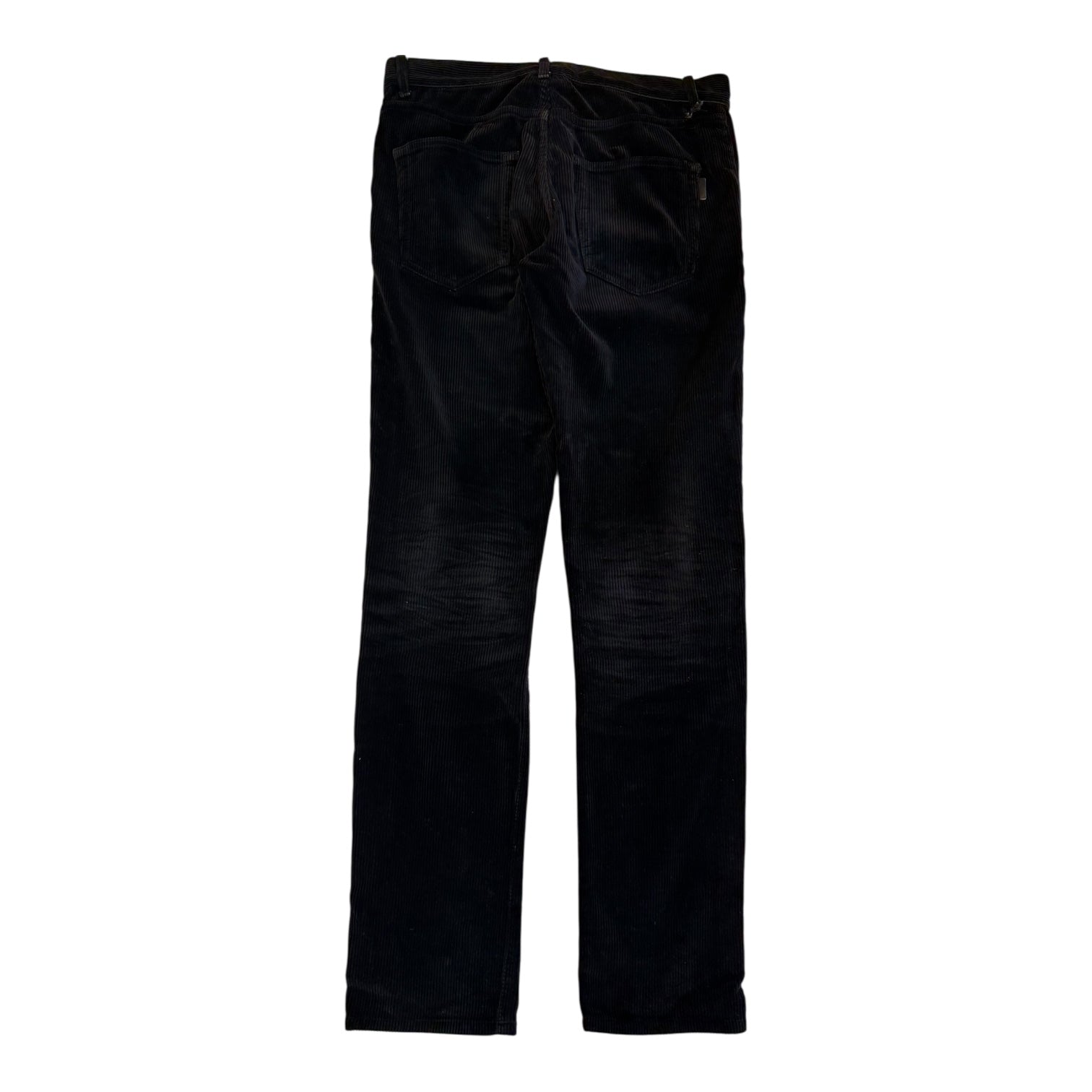 Saint Laurent Black Corduroy D02 2018 tagged size 27 measures 29.5 waist 9.75 rise 12.75 back rise 30 inseam 5.75 leg opening. In good condition with exception of missing silver chain and one belt loop loose.