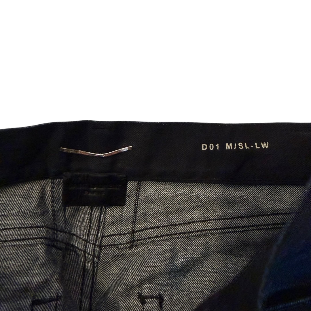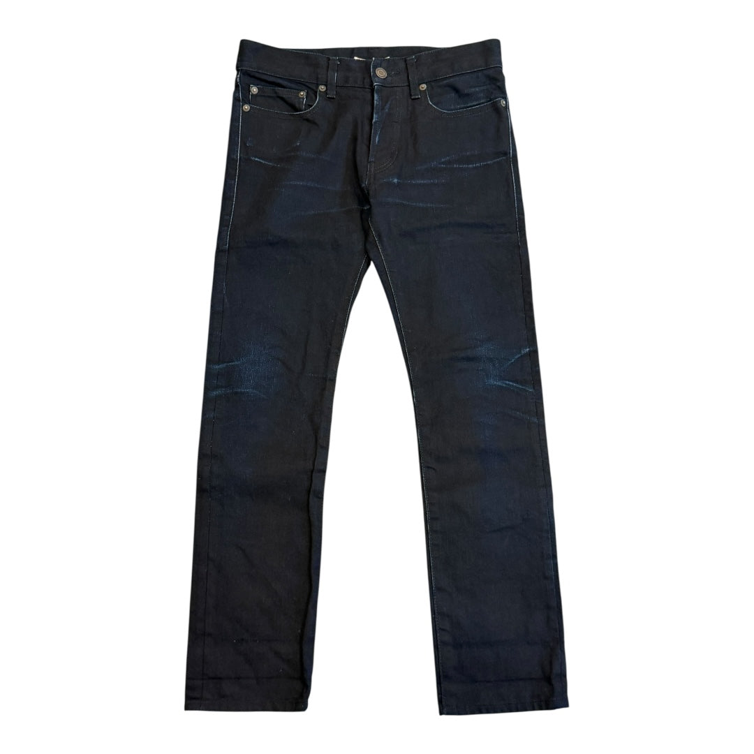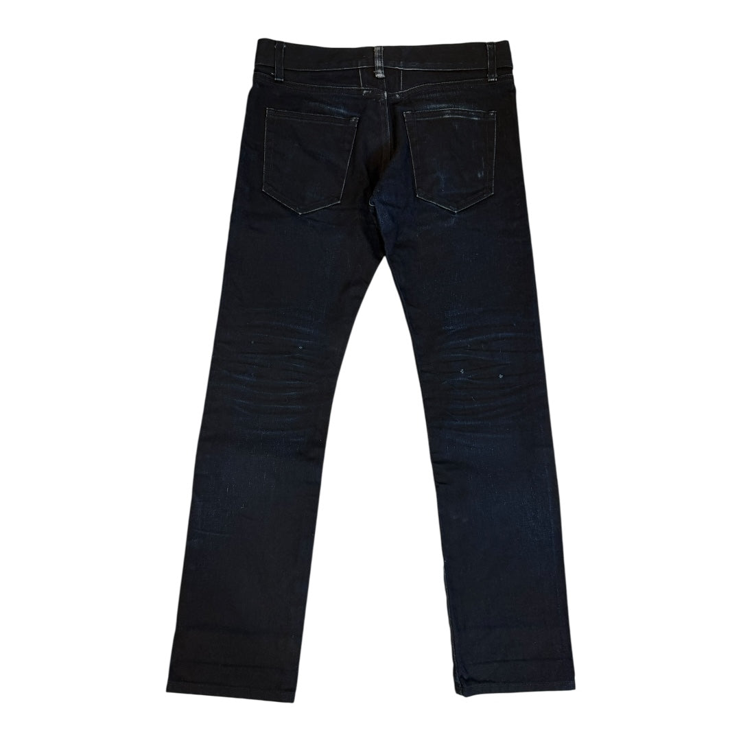 Saint Laurent Autumn 2013 Indigo Overdyed Made in Japan D01 Denim tagged size 27 waist measures 29 rise 9 back rise 11.25 inseam 27.5 leg opening 6. In good used condition with some fading to tags.