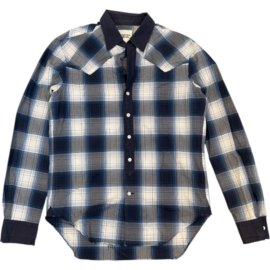 Takihiro Miyashita TheSoloist Raw-Cut Western Shirt in blue white and grey plaid 100% cotton fabric. Some minor fading to collar, no other flaws. Tagged Size 46 measures 19.75 pit to pit 17 shoulders 26.5 length 26 sleeves