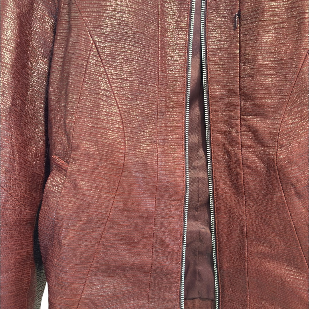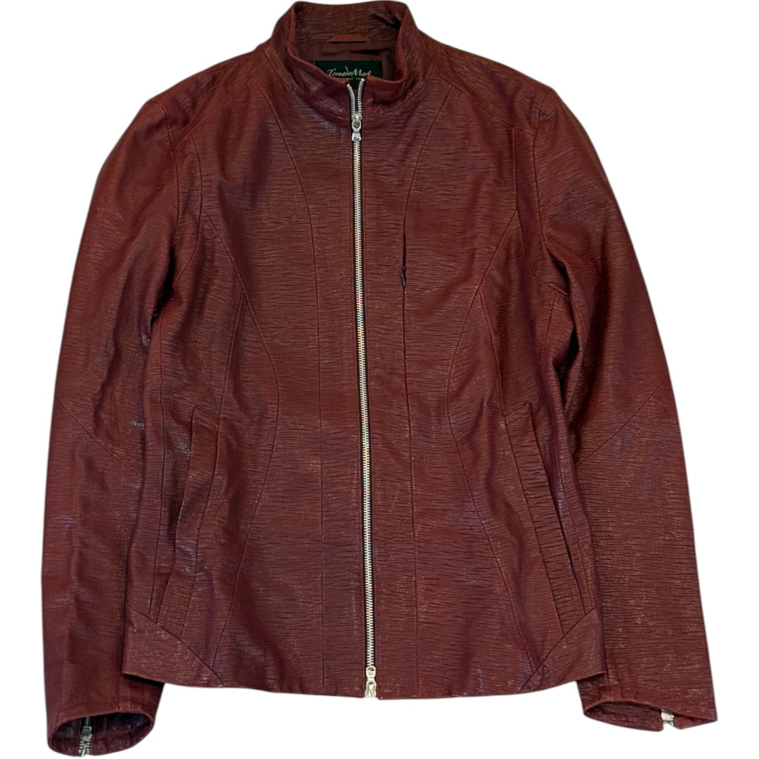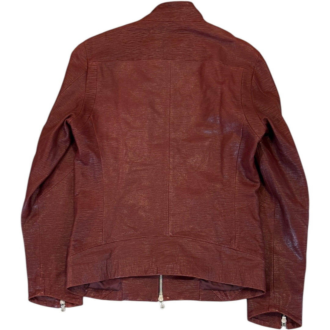 Tornado Mart Textured Goatskin Articulated Motorcycle Jacket in Deep Red, tagged size Large. This gorgeous goatskin racer jacket from Tornado Mart Features a silver double zip closure at center, highlighting its delicately articulated paneling fit and beautiful deep red tone. In perfect condition with no flaws. Measures 20.25 sleeves 17.75 shoulders 25.75 sleeves 26 length