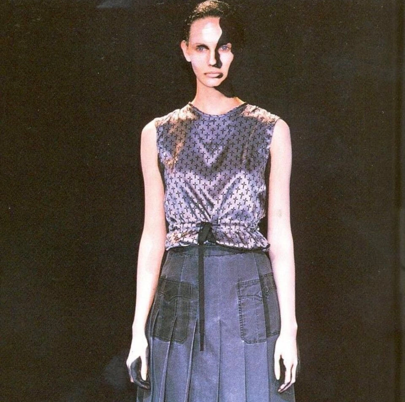 Undercover by Jun Takahashi Spring 1999 ‘Working Class Hero’ Silk Cross-Print Dress in Black. Tagged size free, measures 18 pit to pit 15.5 shoulders 45 length. In flawless condition with no signs of wear.