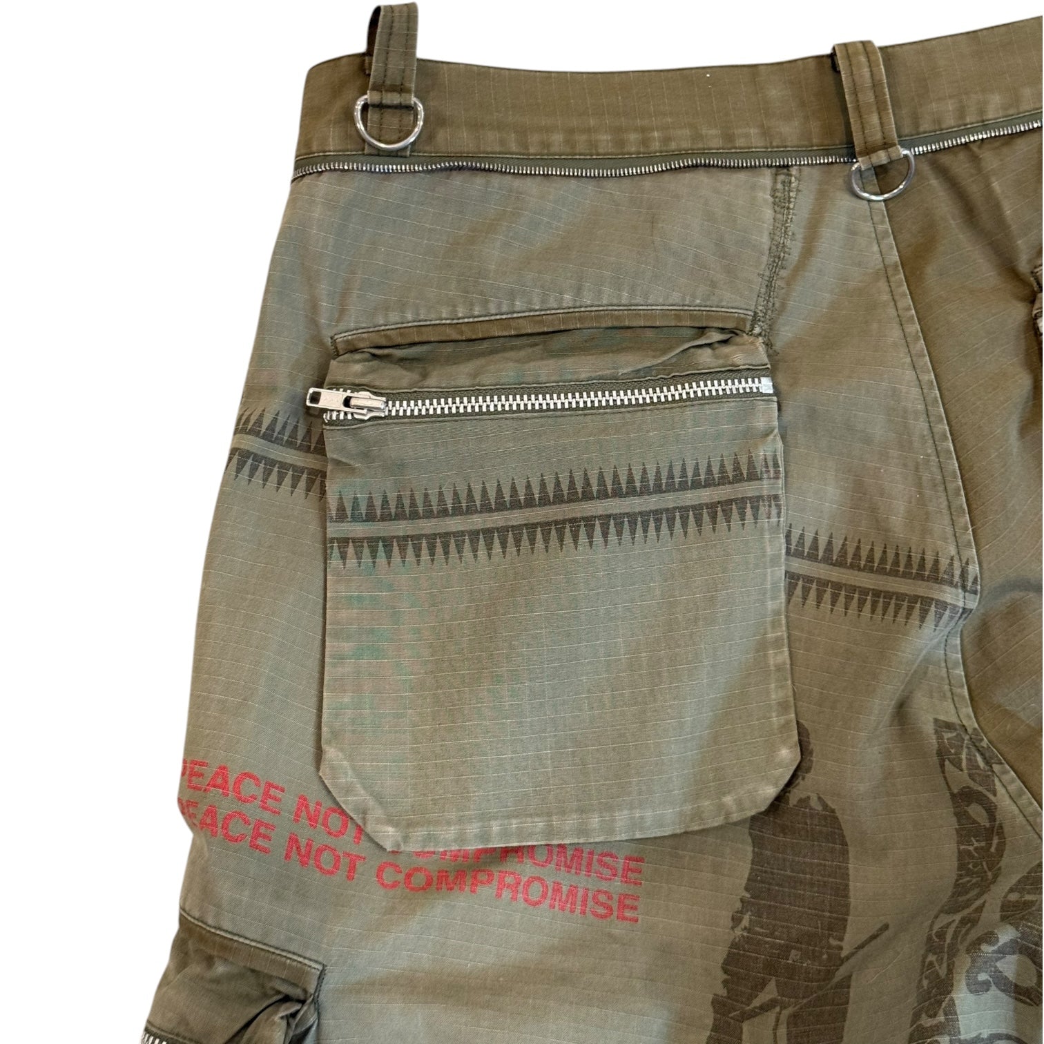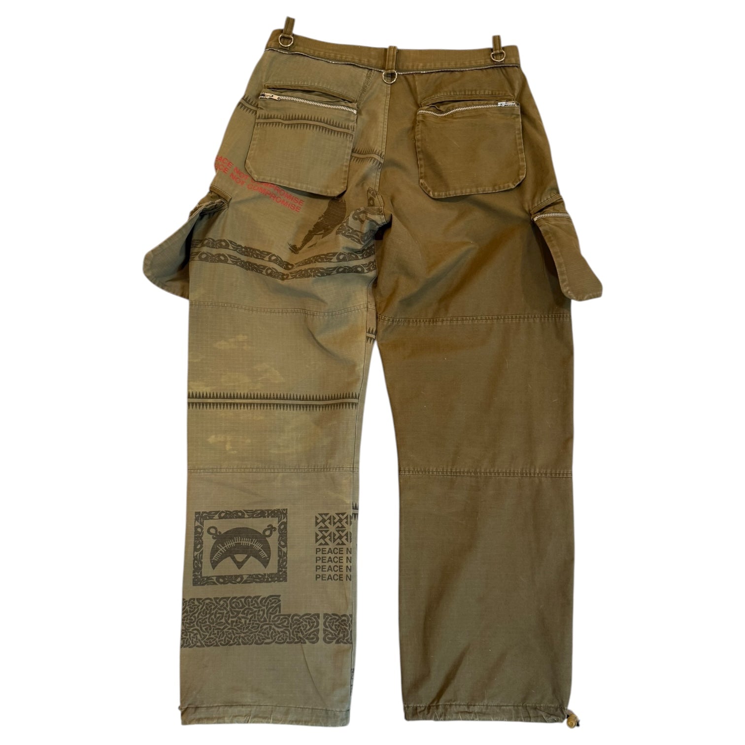 Undercover Spring 2003 ‘Peace Not Compromise’ Scab Cargo - from Jun Takahashi’s Paris Fashion Week Debut, seen on Travis Scott and in March 2025’s Grailed Most Expensive Sales. Size Large, measures 33.5 waist 11.5 rise 13.5 back rise 29.5 inseam 9 leg opening. Internal repair photographed at rear, no other flaws