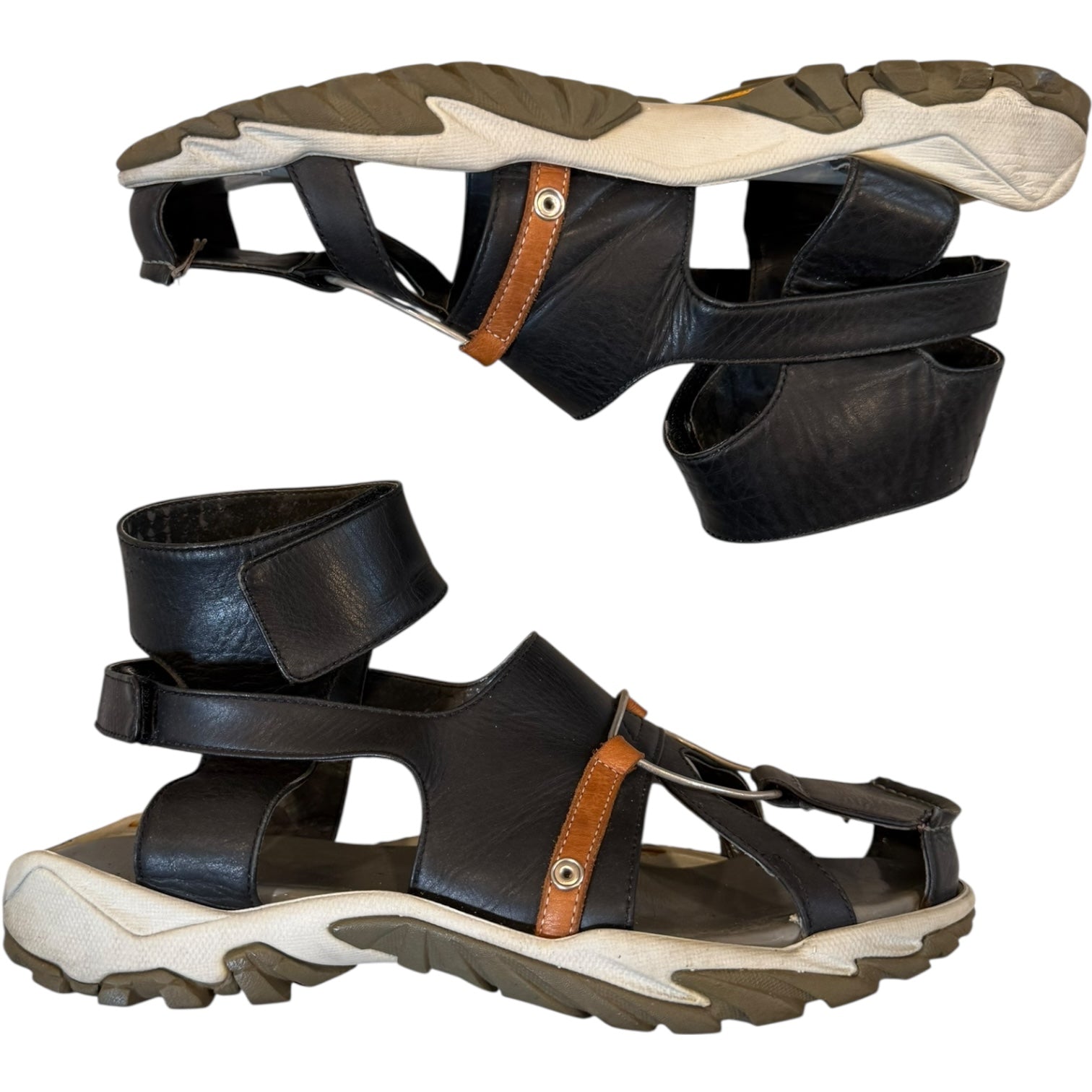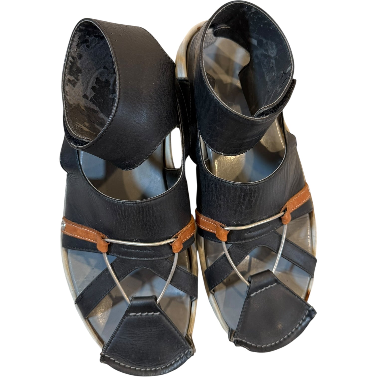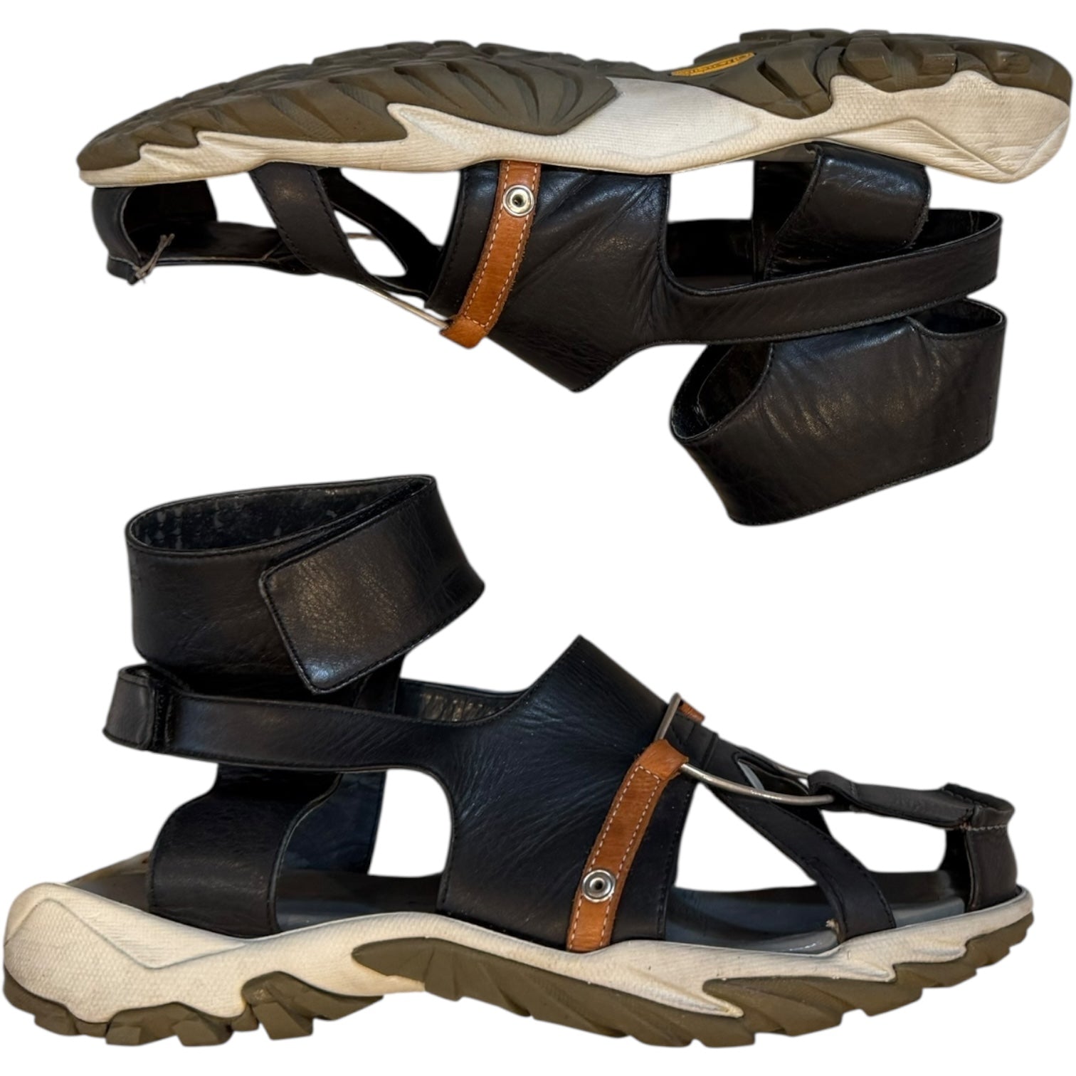 Undercover Spring 2010 ‘Less But Better’ Leather Strapped Vibram Sandals tag size Large best for US9.5-10. Inspired by German industrial designer Dieter Rams 1995 book ‘Less but Better’, Jun Takahashi’s Spring 2010 collection featured minimalist design and futuristic materials in cool grey tones. This pair of cutaway sandals feature a heel and ankle strap in black leather with a Vibram sole and metal wire detailing at the forefoot. Some wear to insole, some creasing at ankle, minor peeling to interior. Comes with box and tags