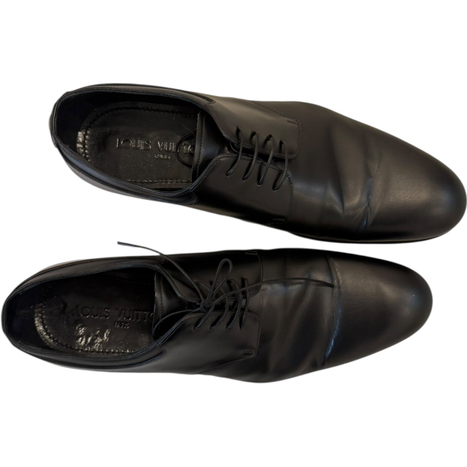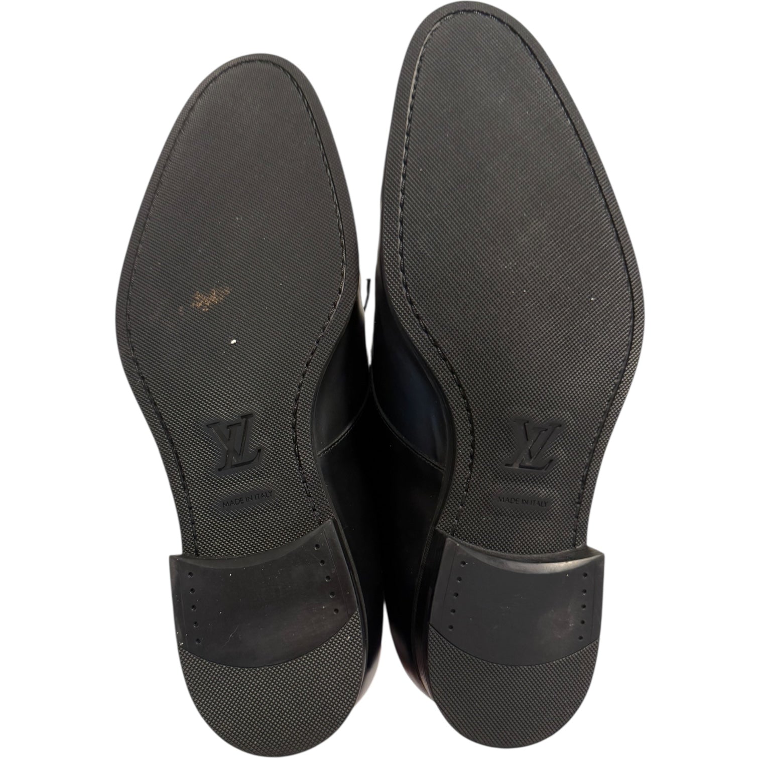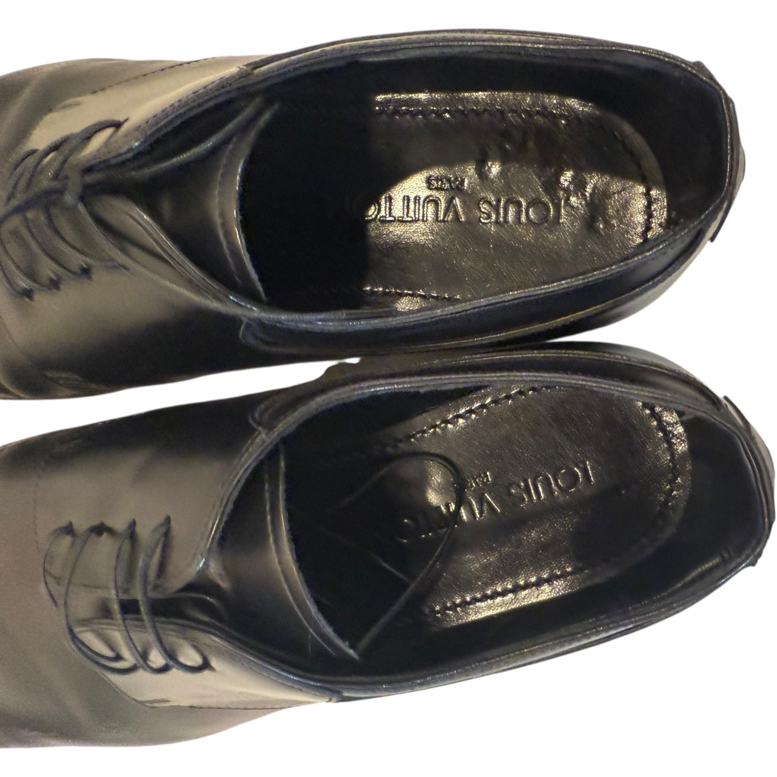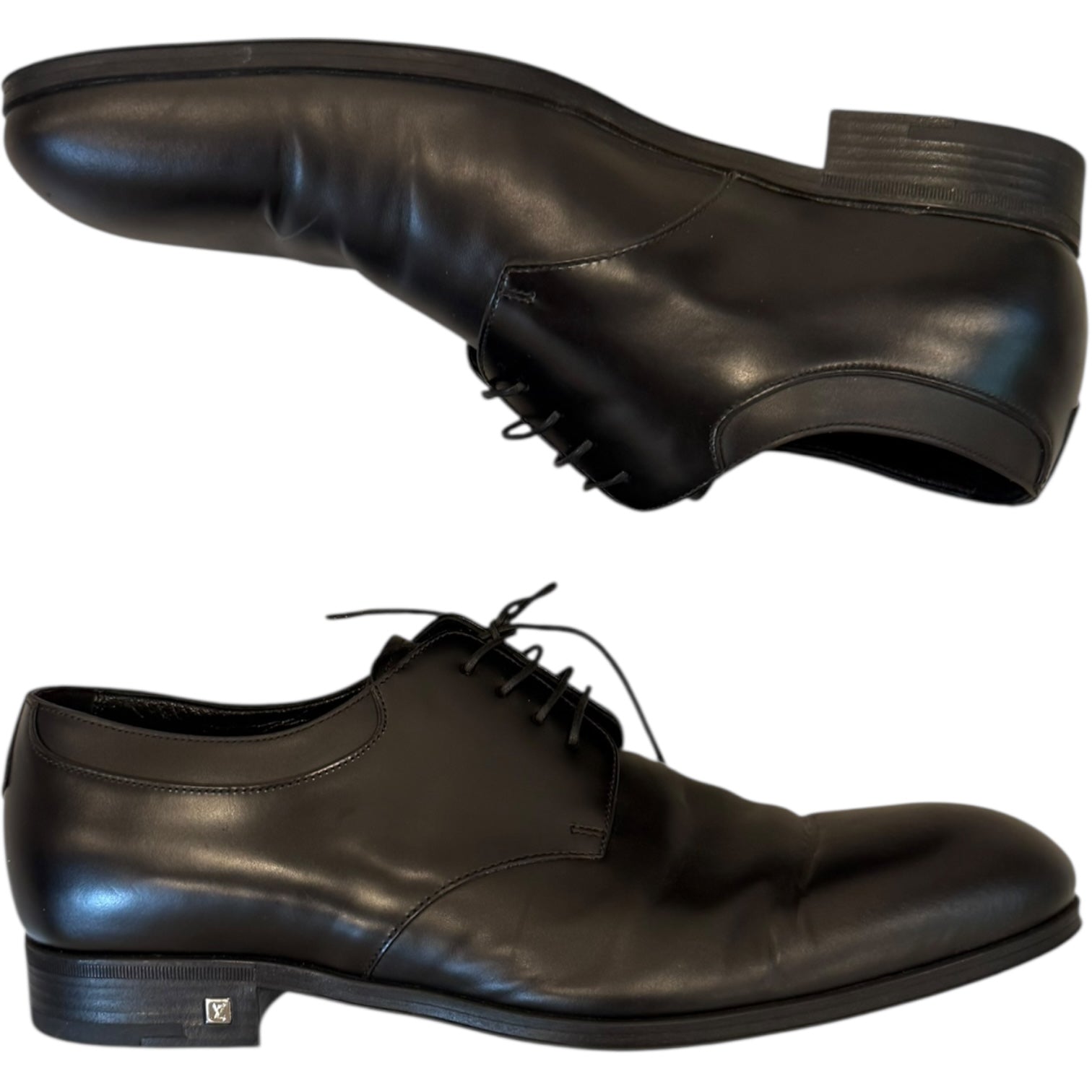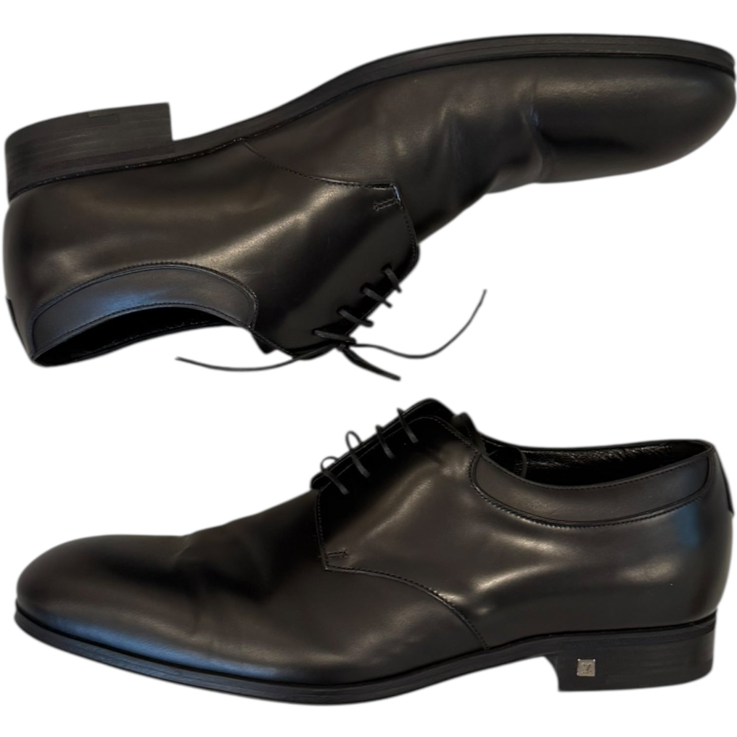 Louis Vuitton Calfskin Derby size UK7/US 8 fits US8-8.5. Inlayed silver metal LV logo in heel, branded rubber outsole with a sleek toe in a smooth matte finish. In incredible condition with very minor creasing, almost no wear.