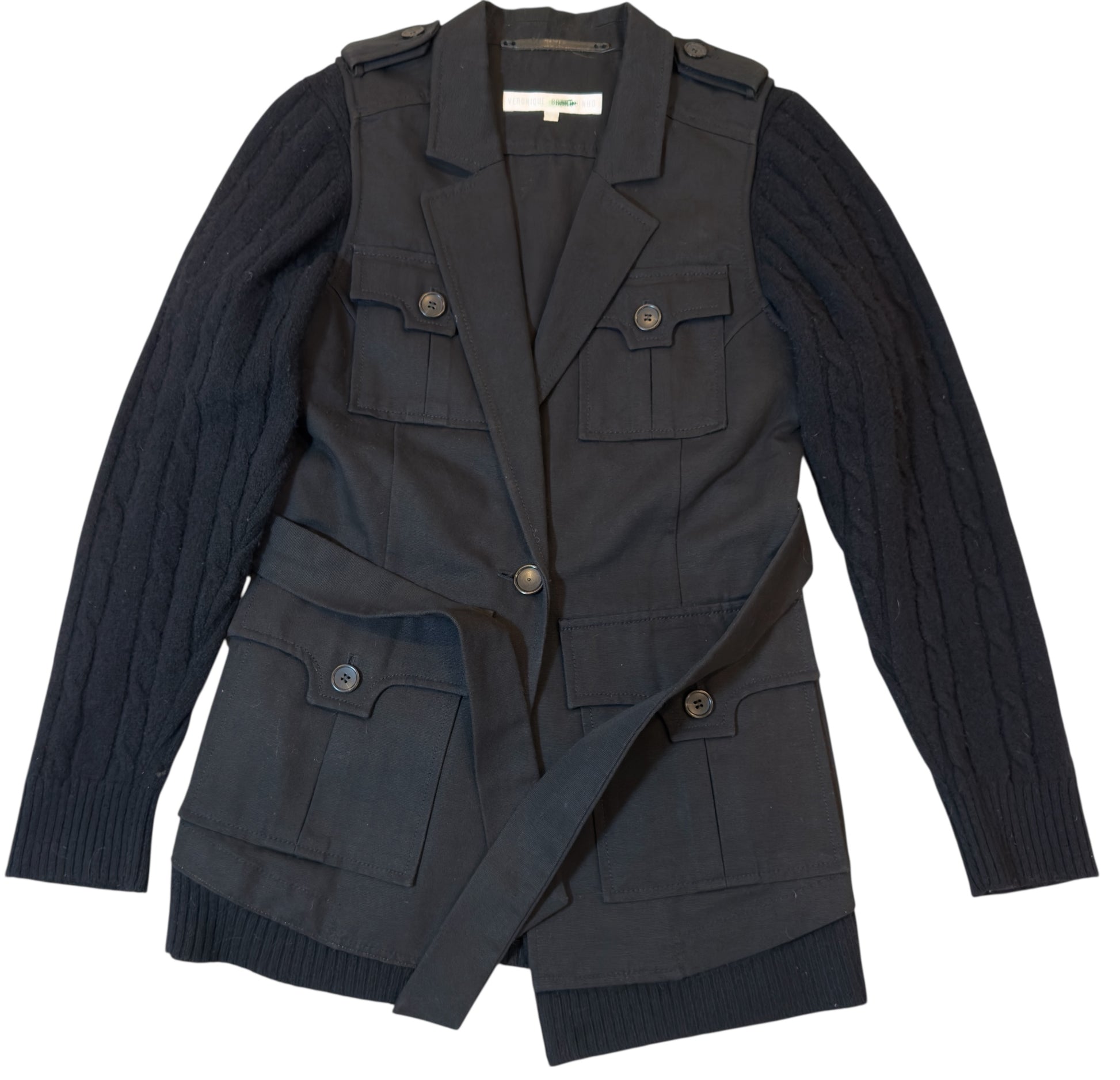 Veronique Branquinho Knit Layered Hybrid Jacket with Belt tag size 38 / fits Men’s S womens M-L shoulders 14.5 pit to pit 16.75 length 29 sleeves 24.25. In great used condition with no noticeable flaws.