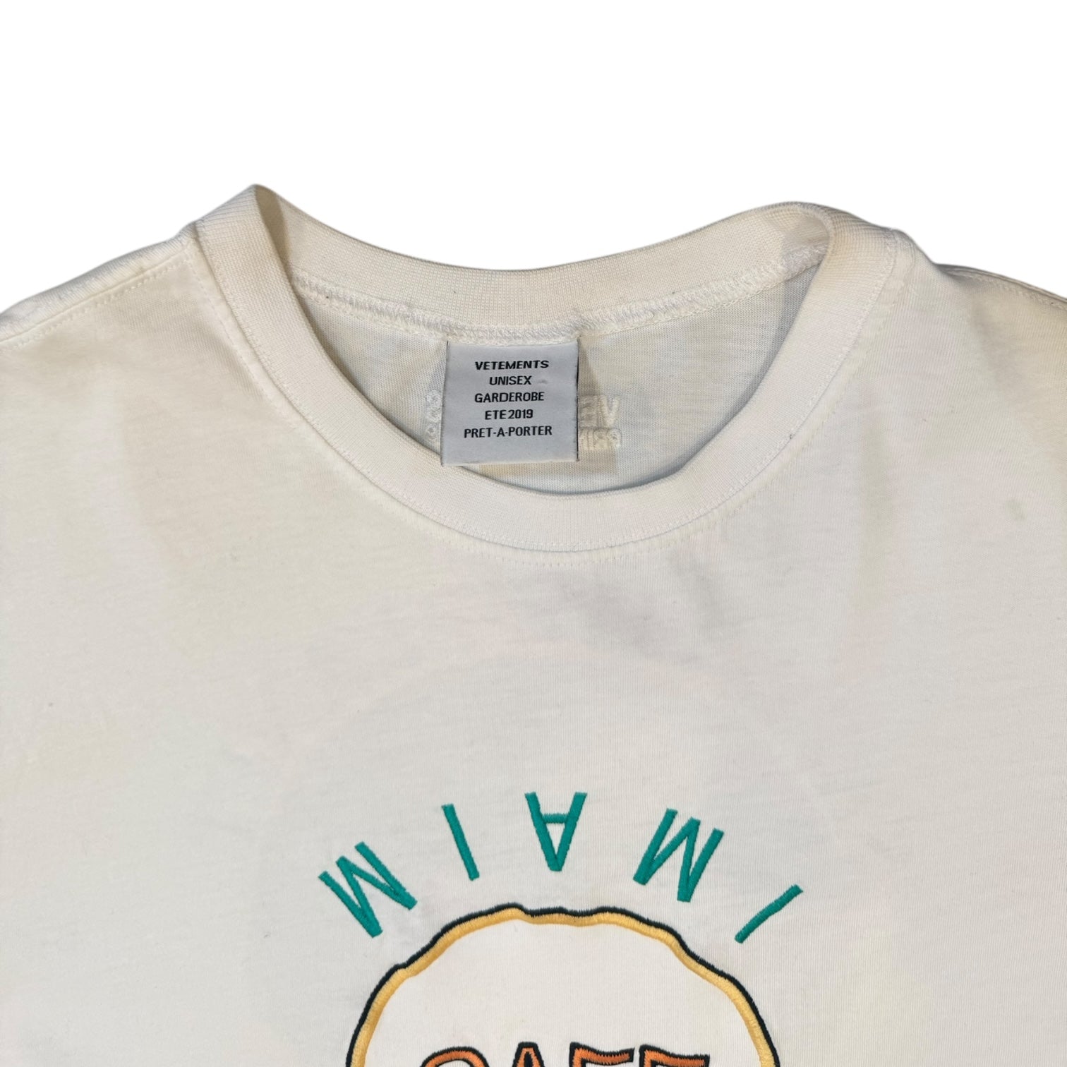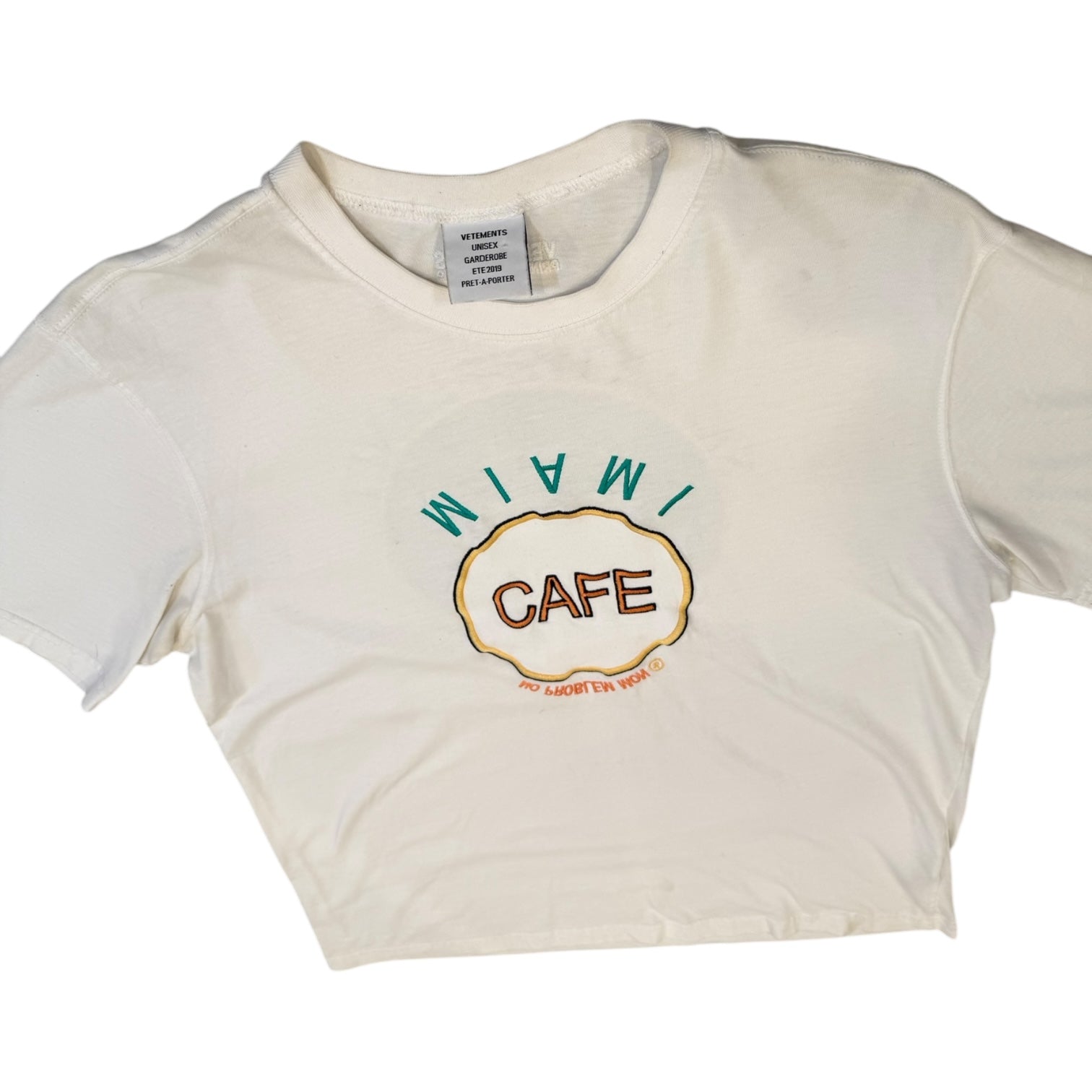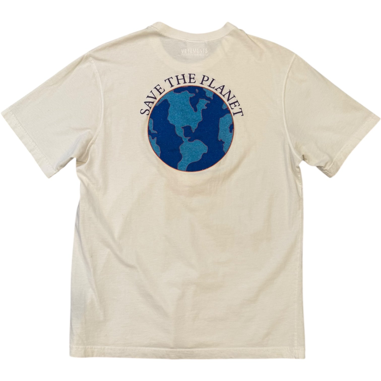 Vetements AW2019 by Demna Gvasalia Miami Cafe / Save The Planet Print Tee, size S. Measures 19.5 pit to pit 18.5 shoulders 26.5 length. features an embroidered upside down Miami Cafe front logo, with a glitter print ‘Save the Planet’ graphic on the back. Good condition, minor discoloration due to use with small marks.