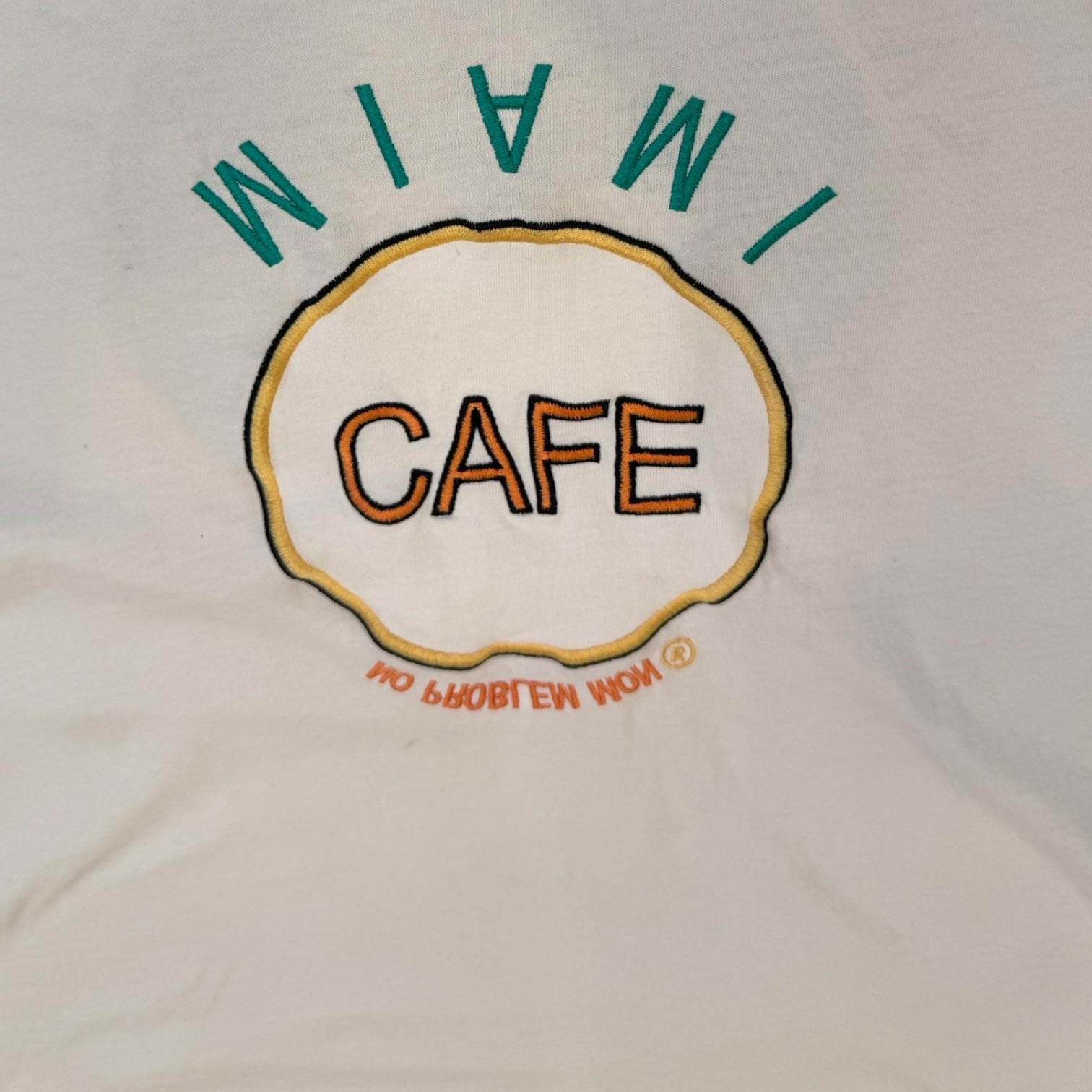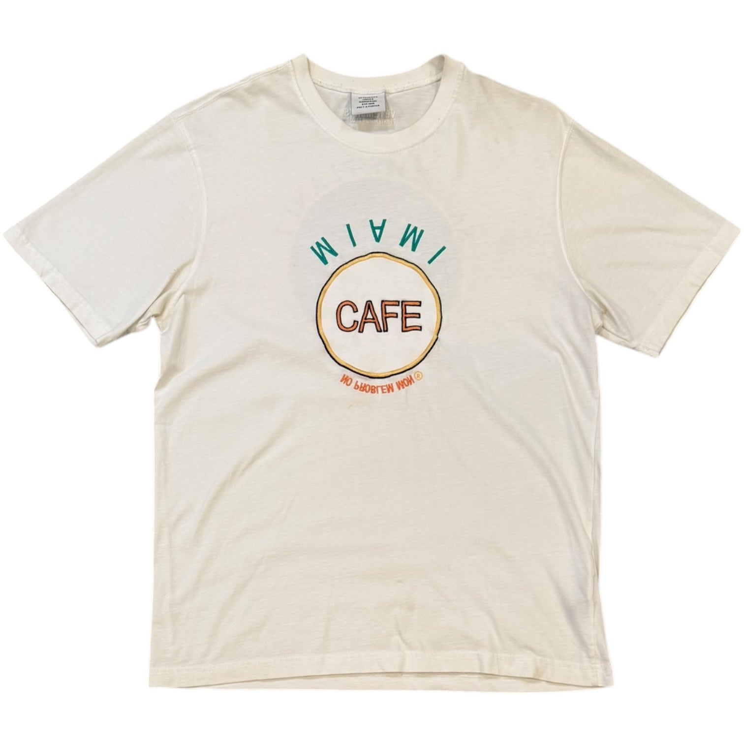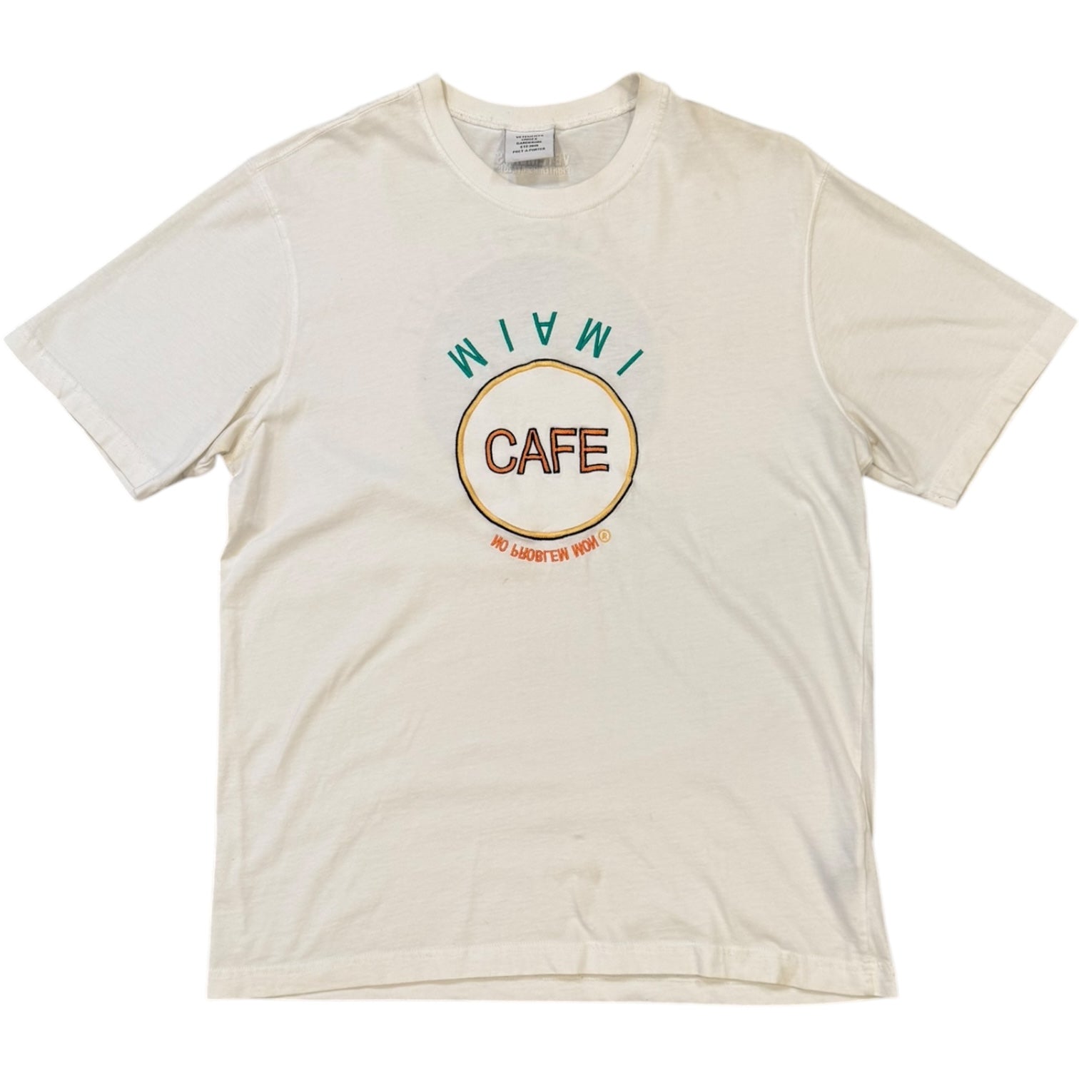 Vetements AW2019 by Demna Gvasalia Miami Cafe / Save The Planet Print Tee, size S. Measures 19.5 pit to pit 18.5 shoulders 26.5 length. features an embroidered upside down Miami Cafe front logo, with a glitter print ‘Save the Planet’ graphic on the back. Good condition, minor discoloration due to use with small marks.