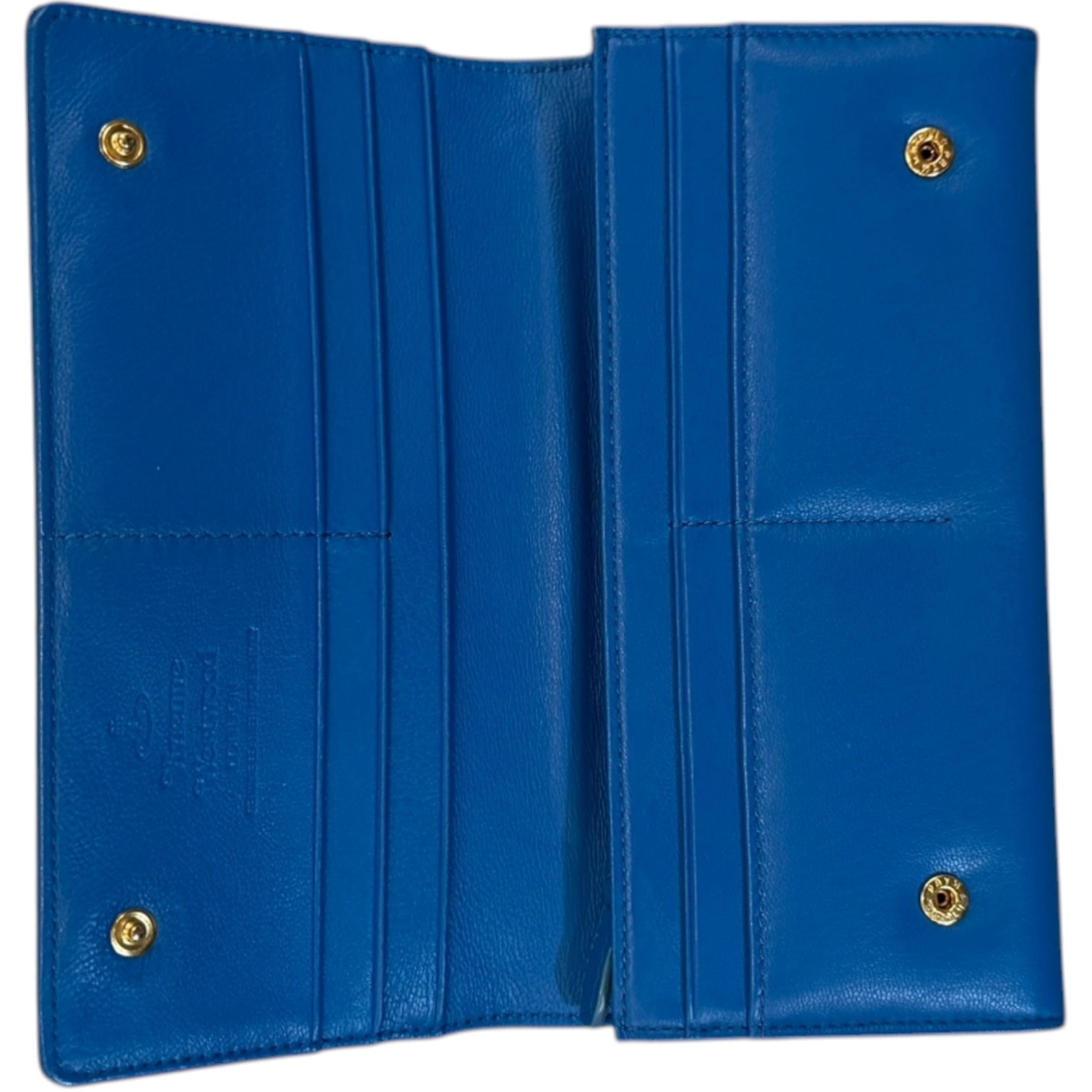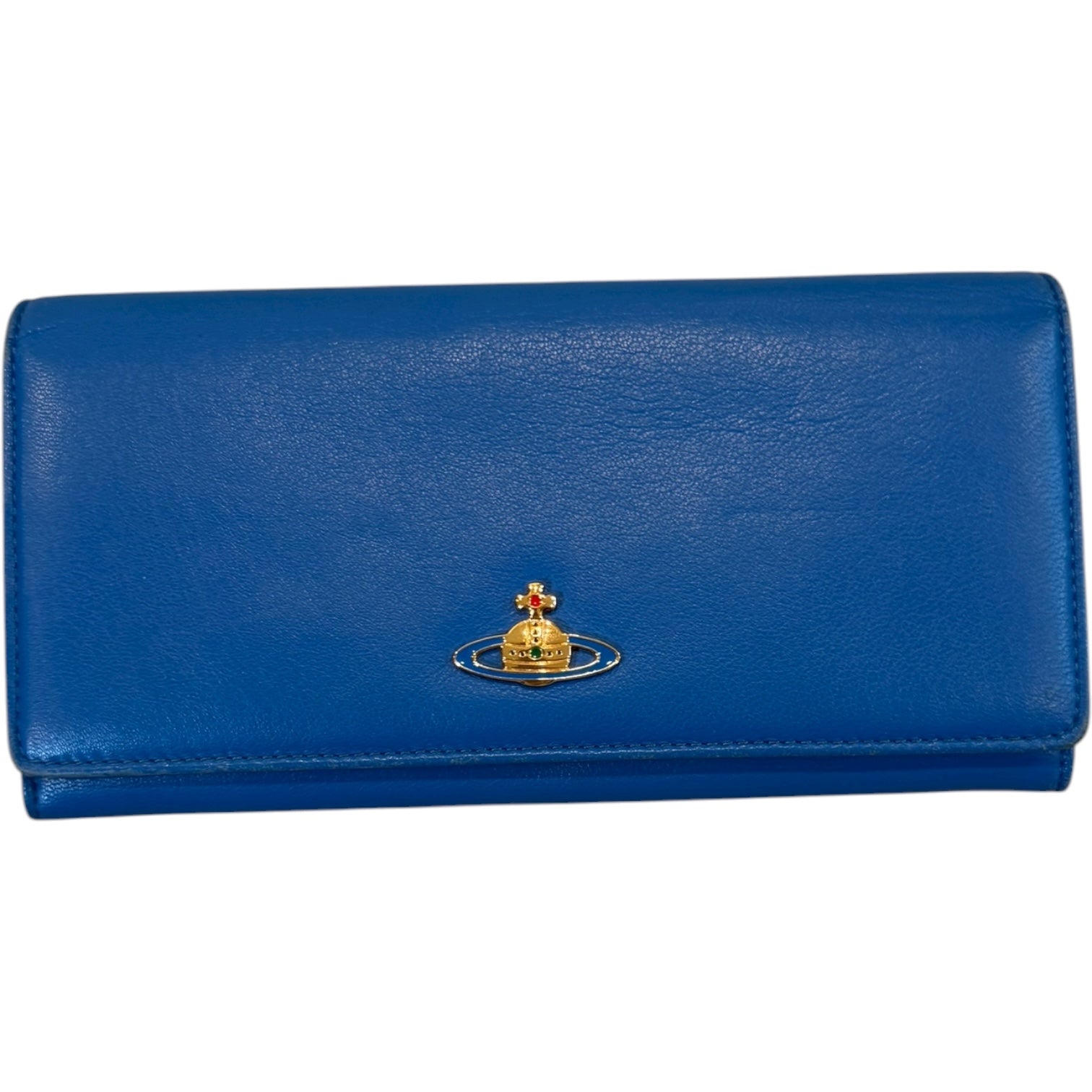 Vivienne Westwood Blue Leather Double Snap Wallet with Enamel Orb, great used condition with minor signs of wear near some edges, mostly unnoticeable.