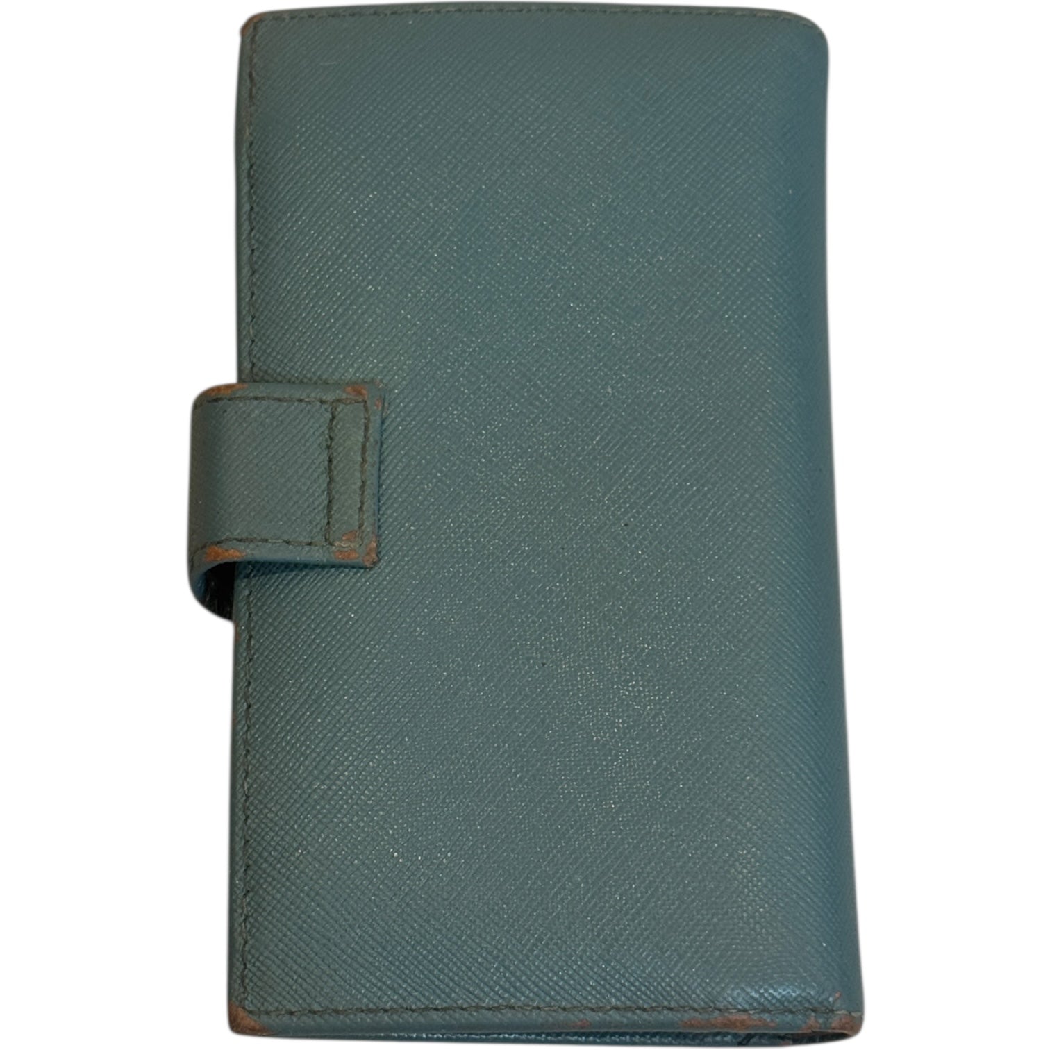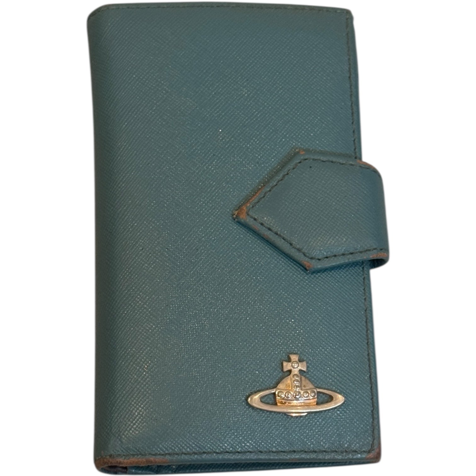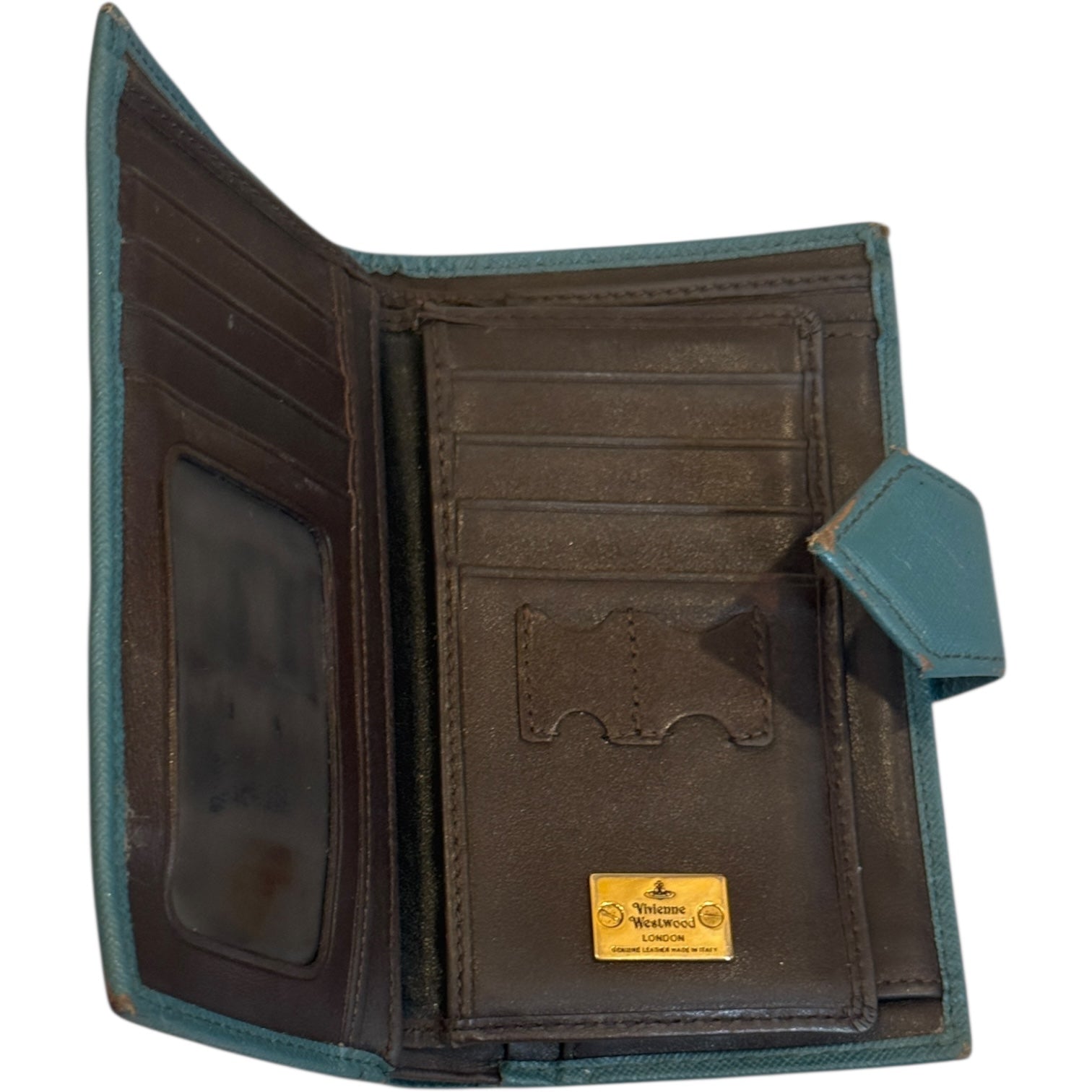 Vivienne Westwood Snap Folding Wallet in Green Saffiano Leather Shell with Brown Calfskin Leather Card Slots and ID Pouch. In used condition, with some color fading near edges, reflected in price. Comes with box.