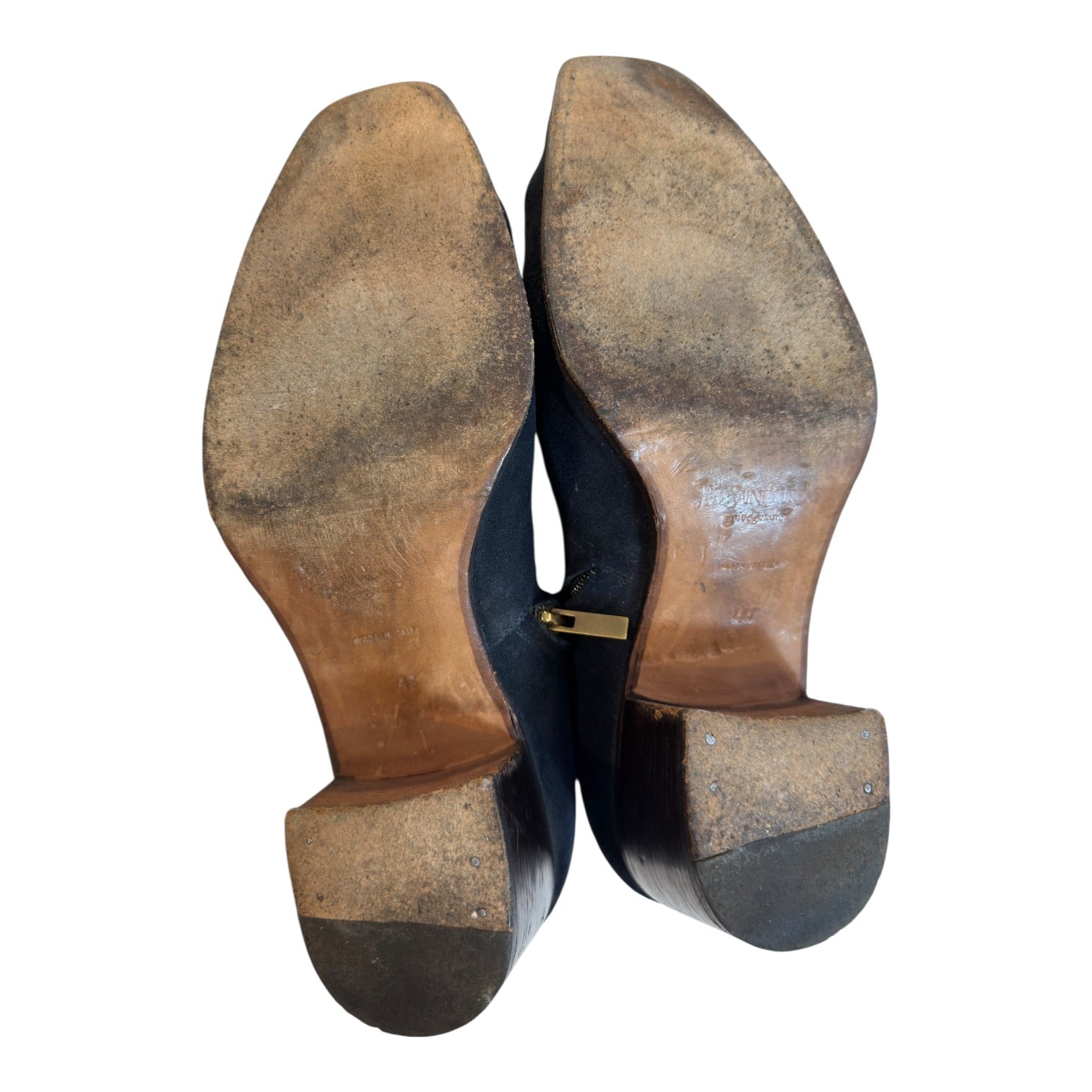 Yves Saint Laurent Rive Gauche Dark Blue Suede Heeled Boots, tagged size 41 / US8 fits US8-9. This rare iteration from YSL Rive Gauche was limited to 200 pairs and features a thick, high-quality suede in a rich dark blue tone. In good used condition, some wear to soles visible in photos as well as minor marks to suede.