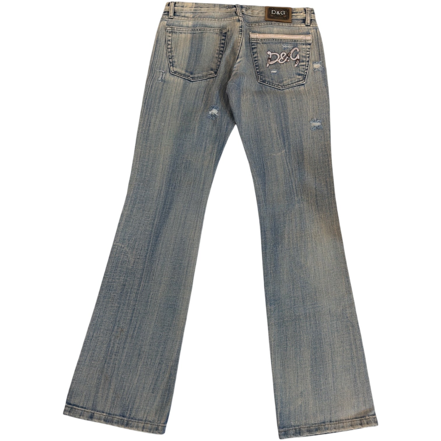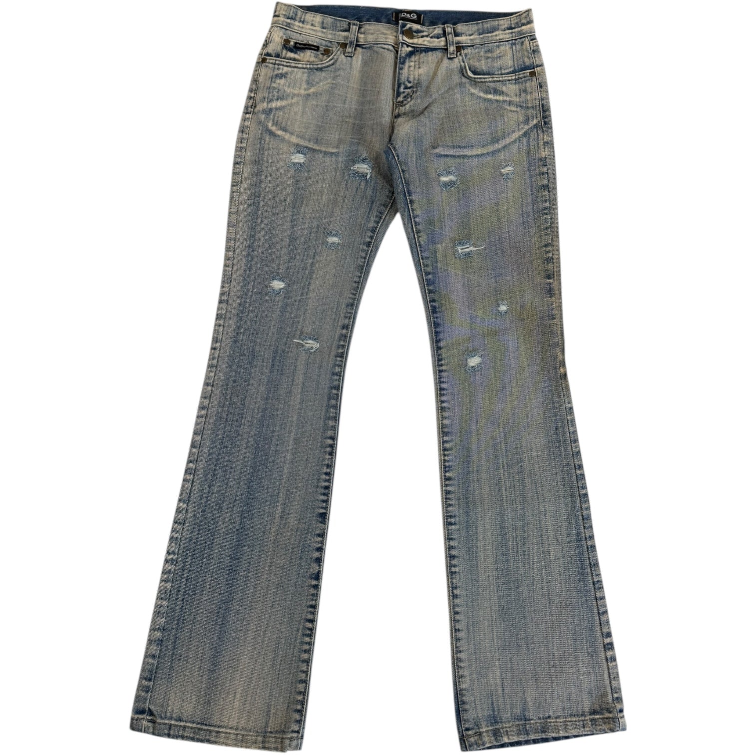 D&G Dolce & Gabbana Distressed Lowrise Bootcut Denim, waist measures 31 rise 8.5 back rise 10.25 inseam 32 leg opening 8.5