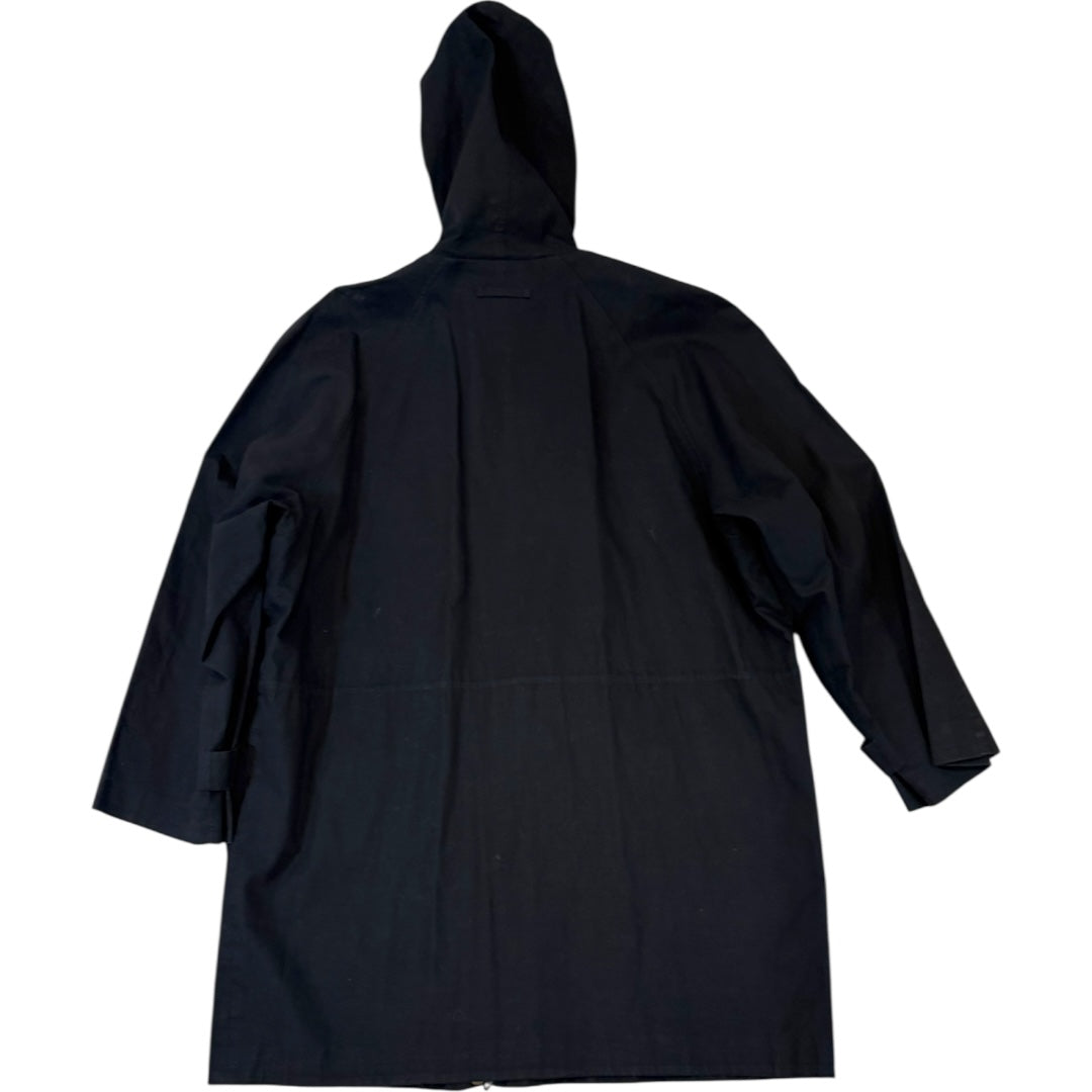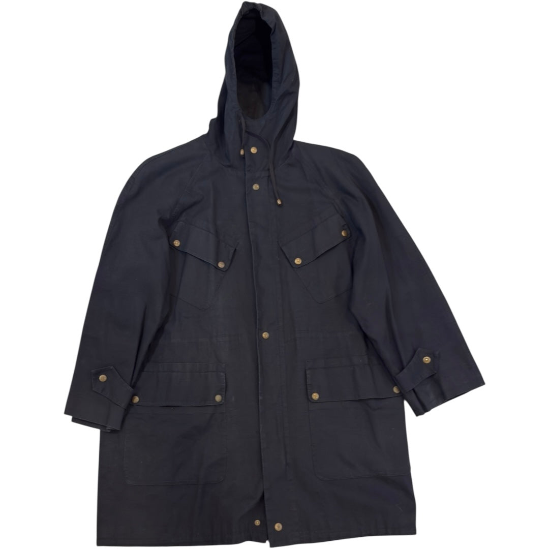 90’s JPG Homme Canvas Raglan Hooded Parka size 48 fits L-XL+. Dark navy cotton blend canvas with quilted lining. Adjustable brass tone snap closures and hood pulls with a wide pit to pit for wearing over your clothes as needed. Measures 26 pit to pit 30 sleeves to neck 38 length. In reasonable used condition with some marks from wear