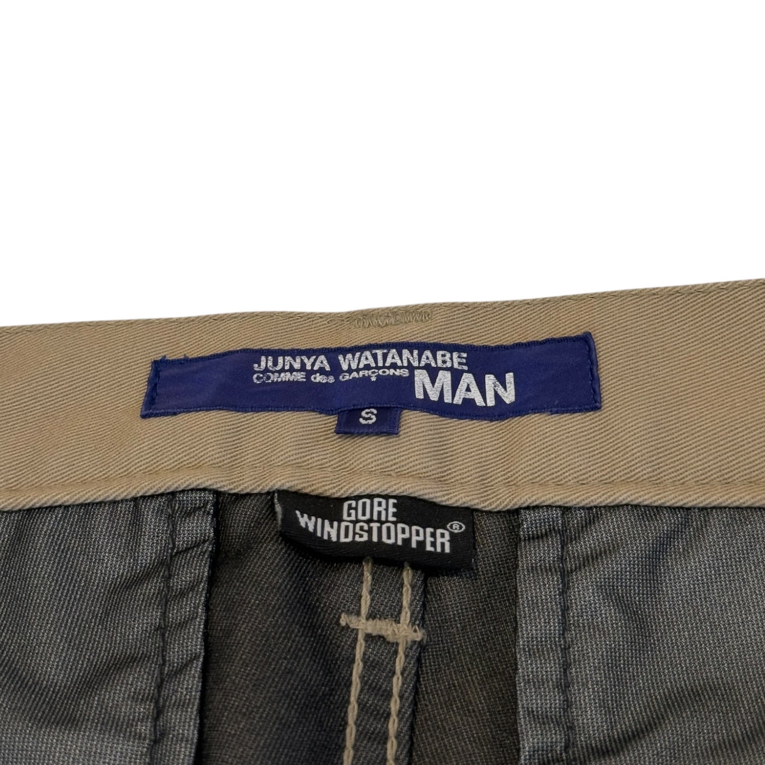 Junya Watanabe Autumn 2005 Goretex Windstopper Trousers tag size S waist measures 29.5 rise 13 back rise 15.5 inseam 29.5 leg opening 8.5. No flaws, crease detailing at center leg with hidden ventilation zippers backed in mesh.