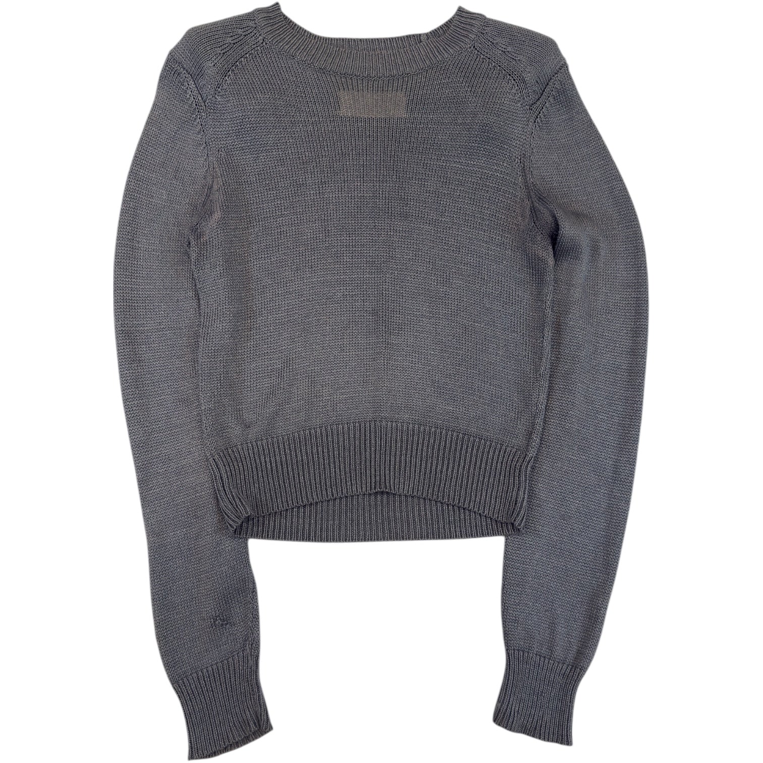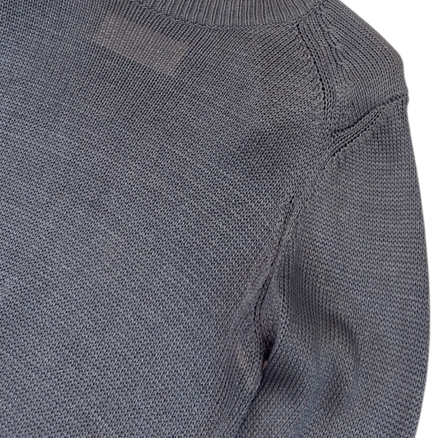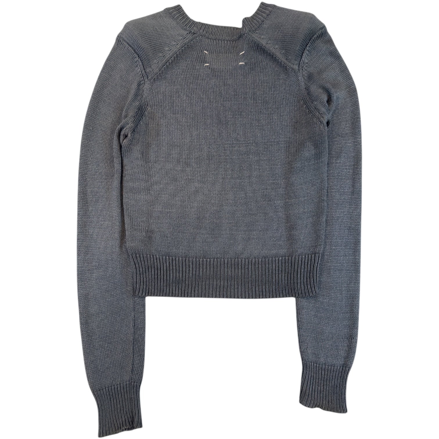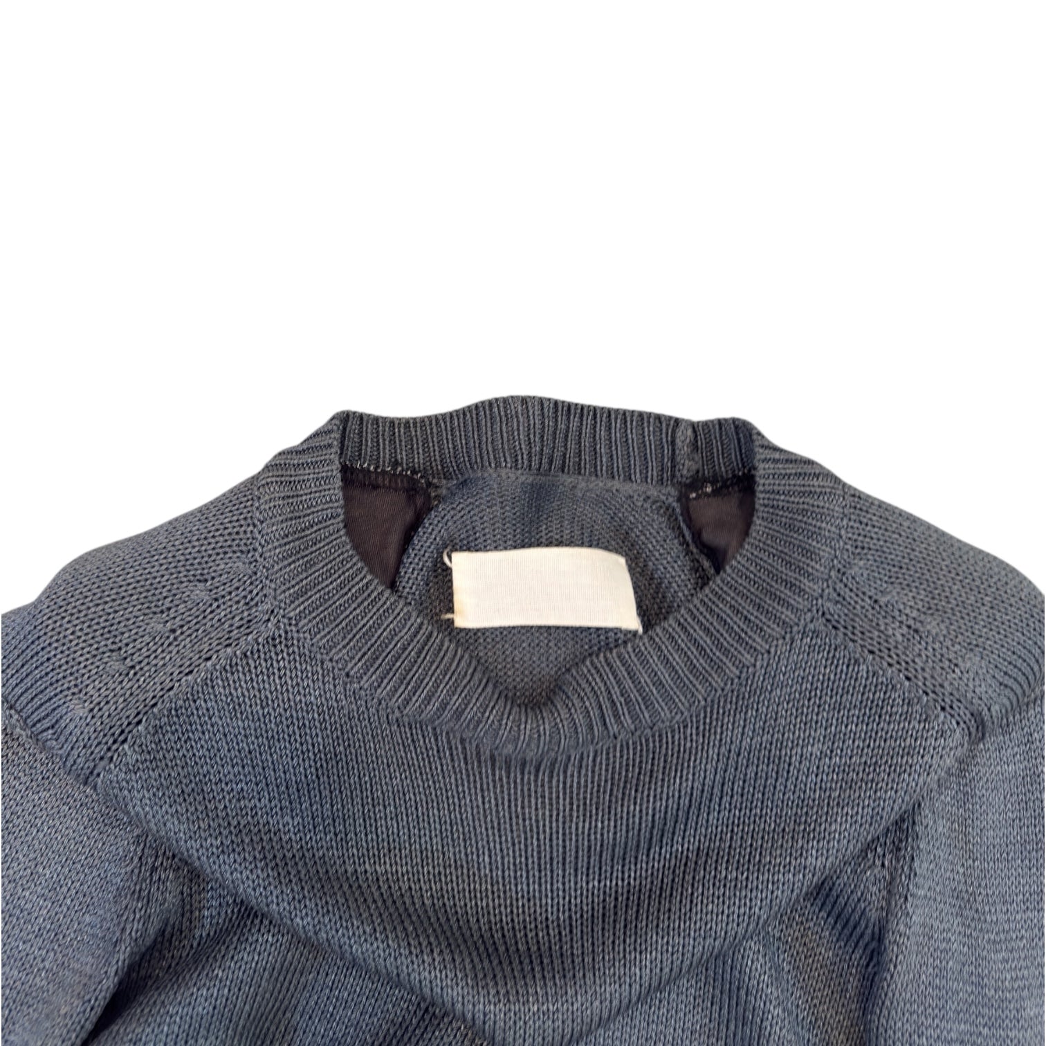 Martin Margiela Spring 1997 Runway Shoulder Padded Knit in Slate Grey / Smokey Blue. Miss Deanna period, no tagged size. Fits womens L men’s XS-S. Stretchy knit with slight texture and sheen. Measures 17.75 pit to pit 15.75 shoulders 26 sleeves 24.25 length