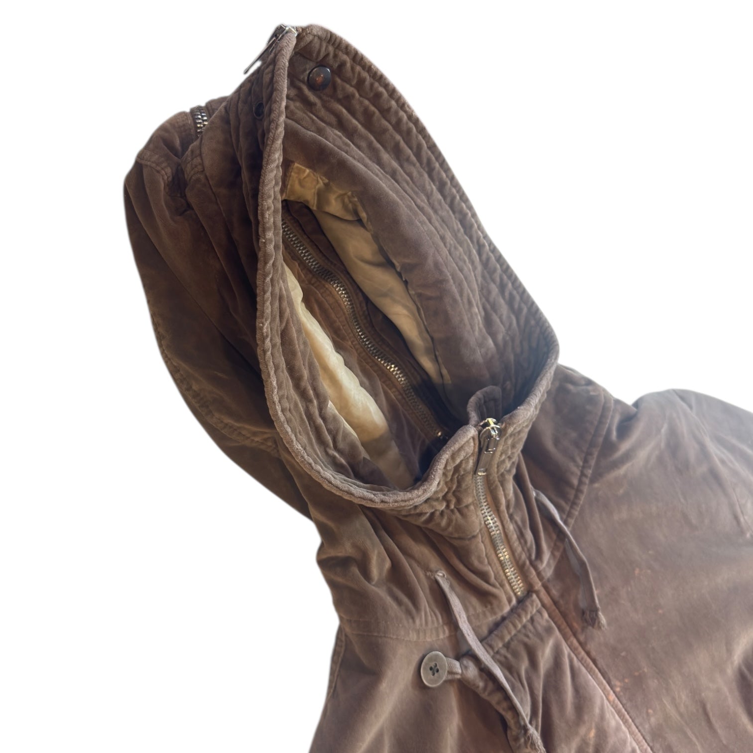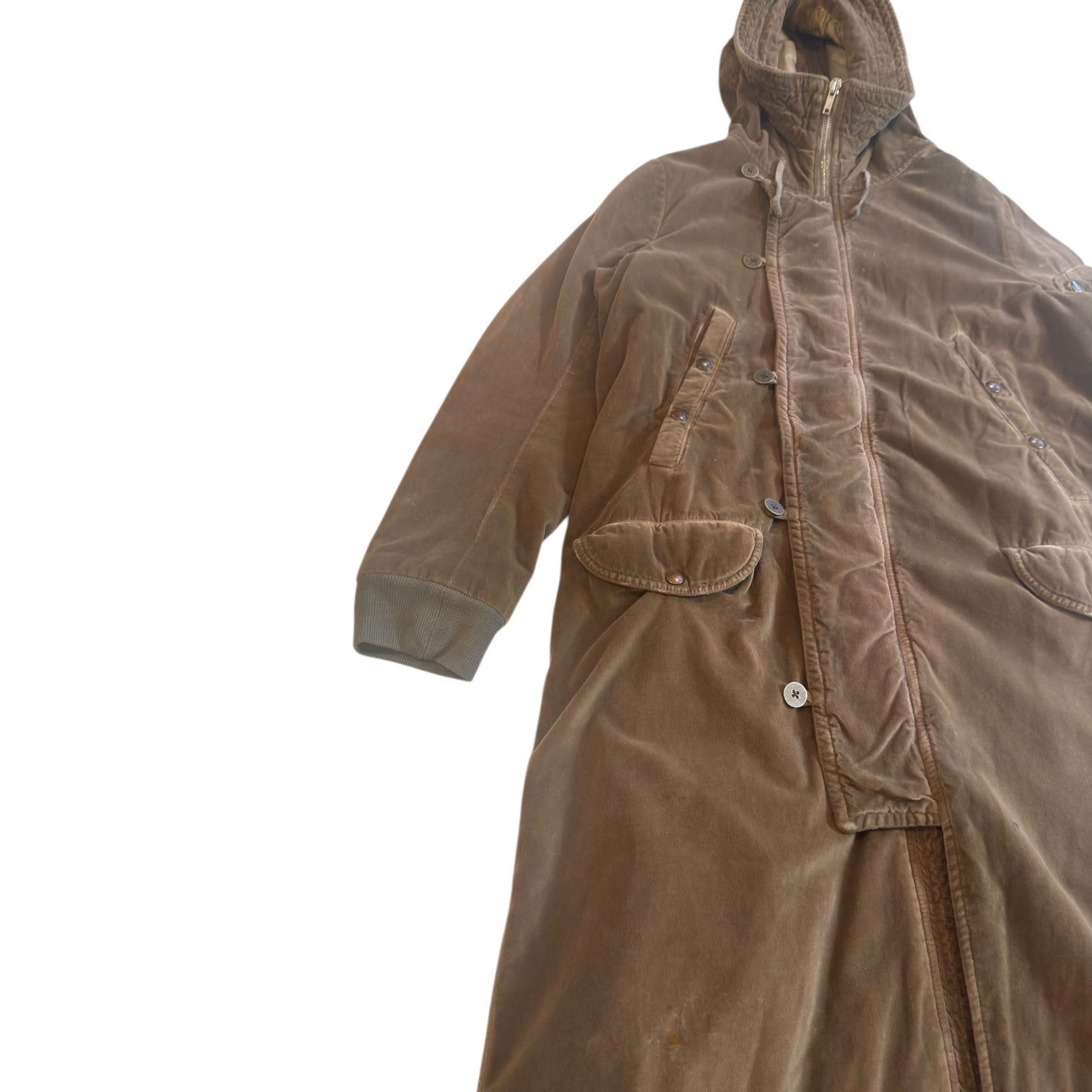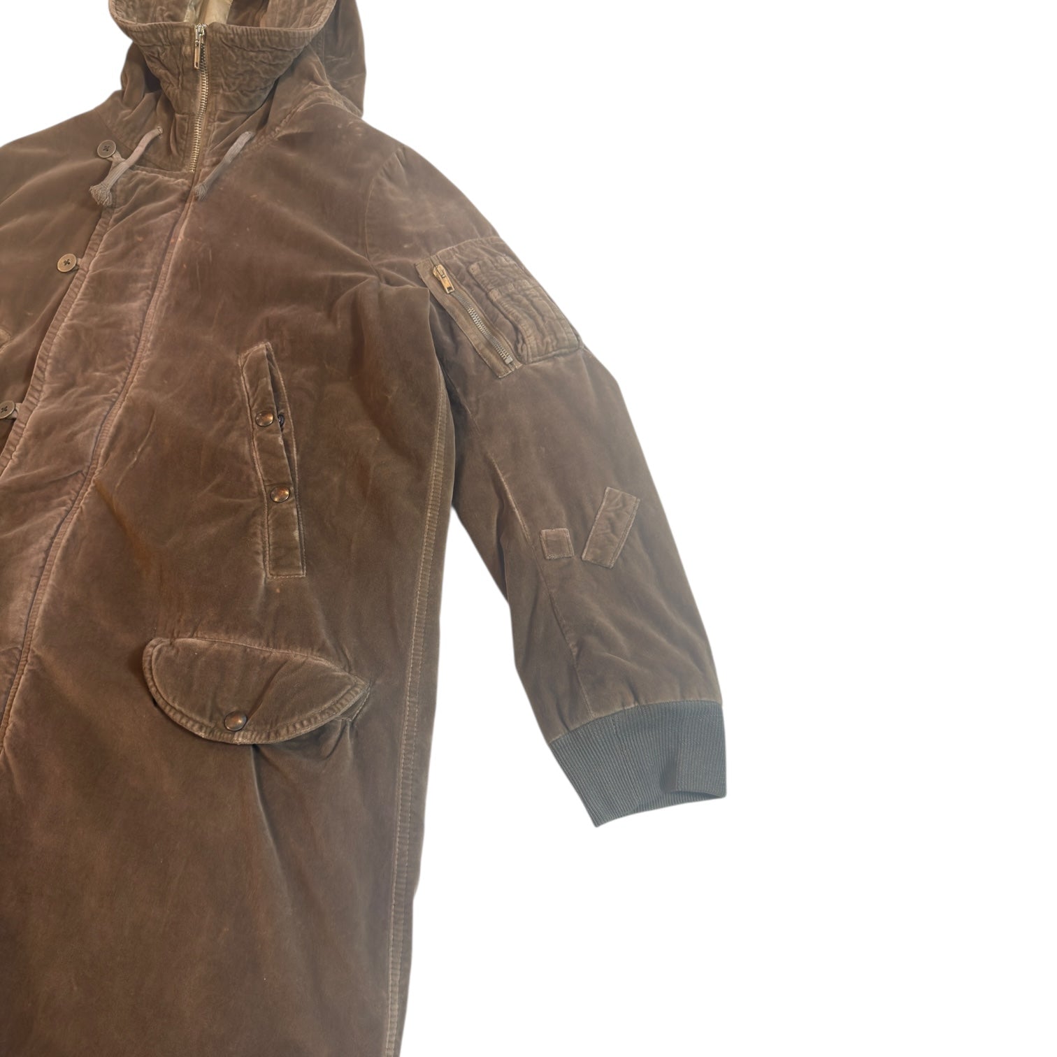 Rick Owens Autumn 2007 Velvet Exploder Parka in Medium Brown / Dust, tagged size M measures 19 shoulders 24 pit to pit 44 length 26.5 sleeves. Heavy padded coat with Raccagni zips, metal buttons and full zip hood. Repair on sleeve, pictured, as well as replaced hem lining and small discolorations visible under inspection.