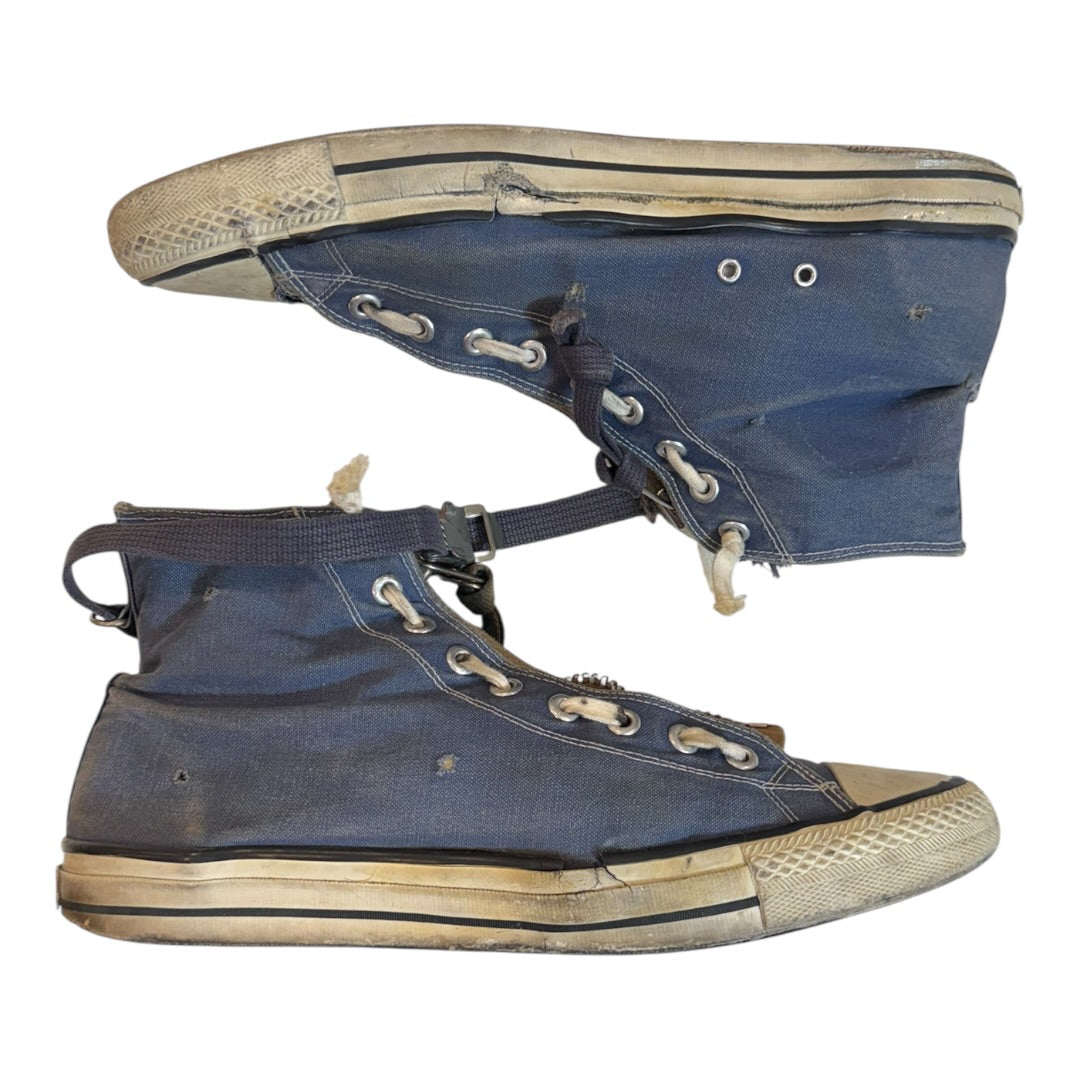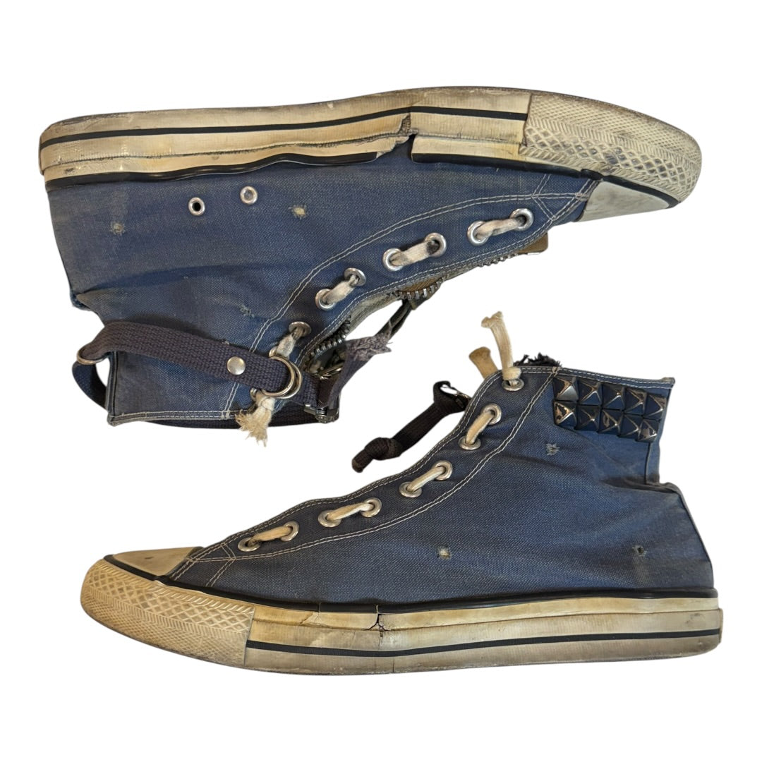 Undercover x Takahiro Miyashita Studded Rebuilt Converse, in rare blue, rare size XL fits US10.5-11. This collaborative project between Jun Takahashi and Takahiro Miyashita is from late 2009, shortly after the latters departure from Number (N)ine. The pair destroyed and rebuilt bootleg ‘Converse’ style trainers in the style of Undercover’s iconic Spring 2006 Studded Boot, using repurposed milsurp zippers and straps with heavy metal hardware and studding. In worn condition with one broken zipper, these soles are still soft and wearable, but due to cracking and separation will need a sole swap in the future. Don’t miss this rare colorway and size of one of archive’s most elusive collaborative sneakers.